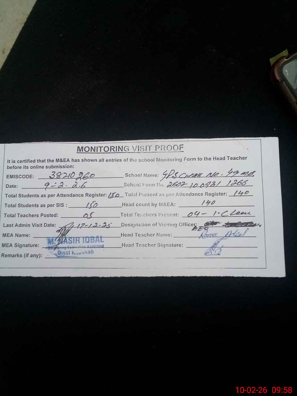 | EMIS Code: 38210260 | Name of School: GPS CHAK NO 49 MB | |||