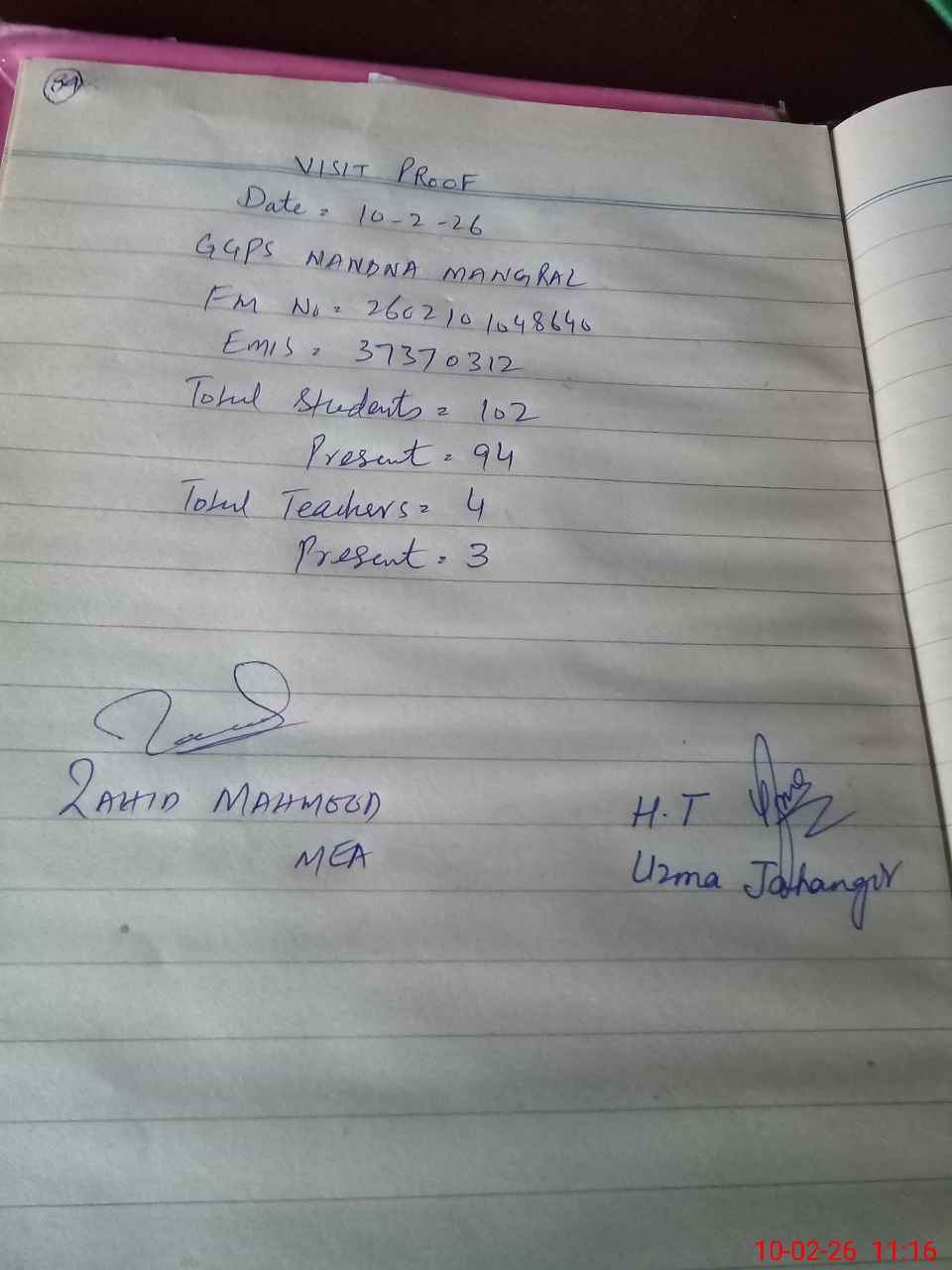 | Certified that this School was Inspected by the Undersigned MEA/DMO Today and the Information Stated Above is as Per Record. | |||||