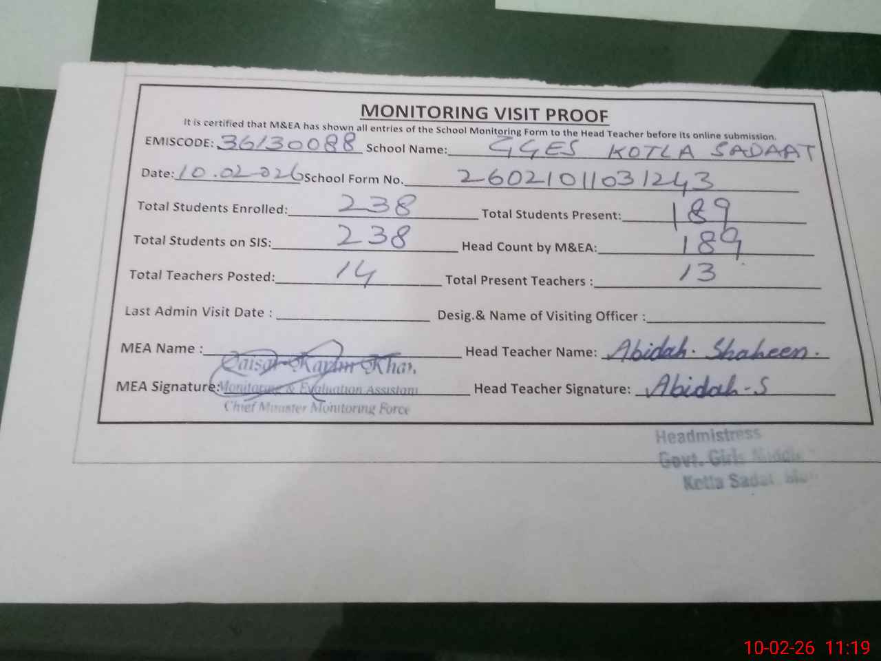 | Certified that this School was Inspected by the Undersigned MEA/DMO Today and the Information Stated Above is as Per Record. | |||||