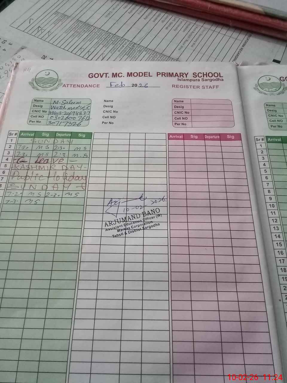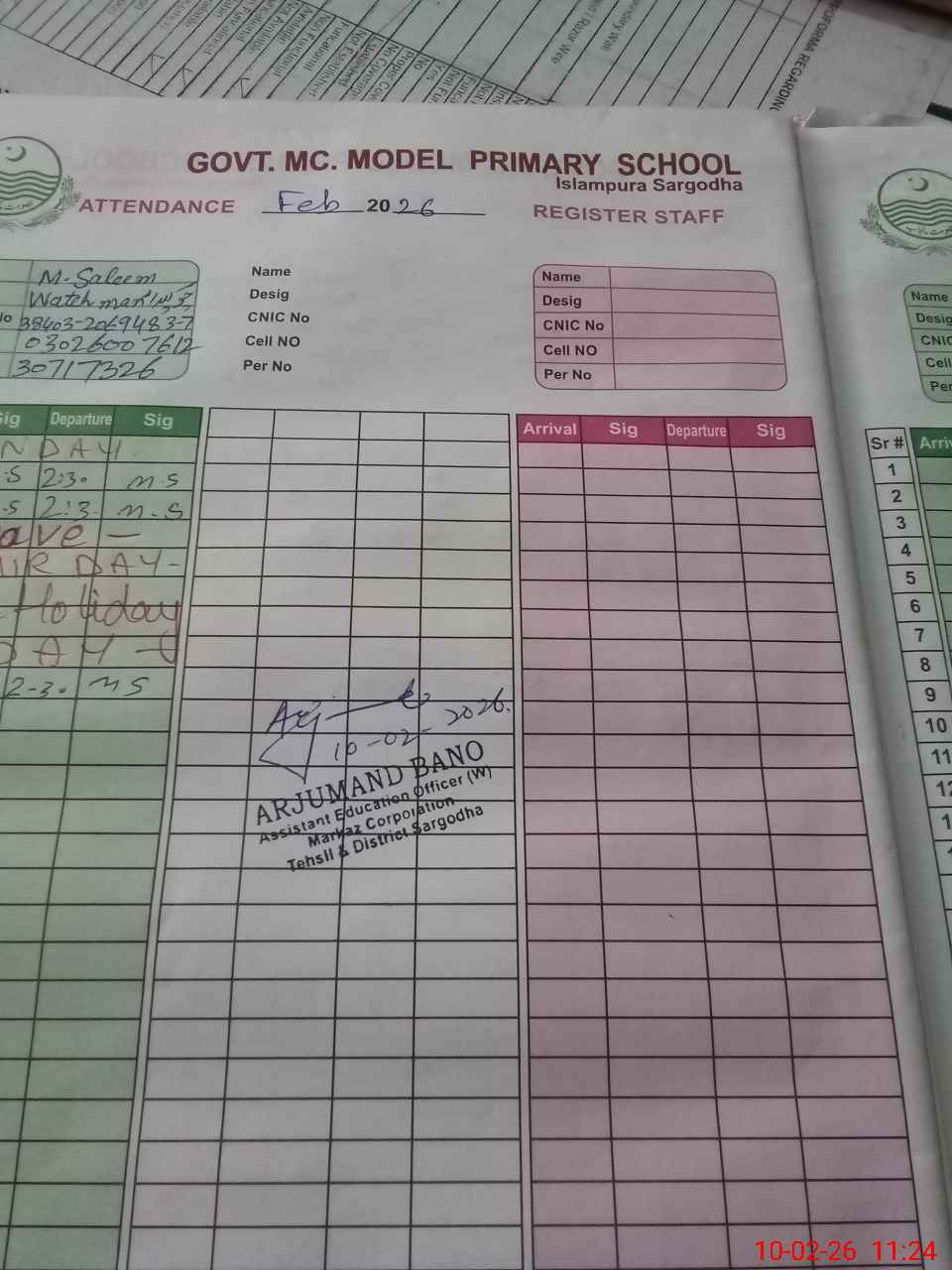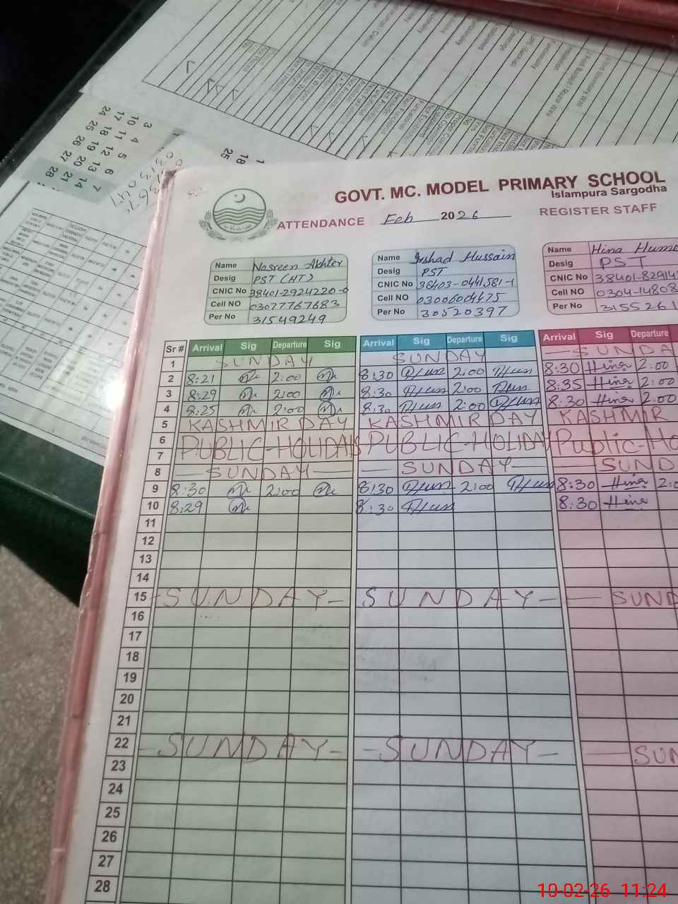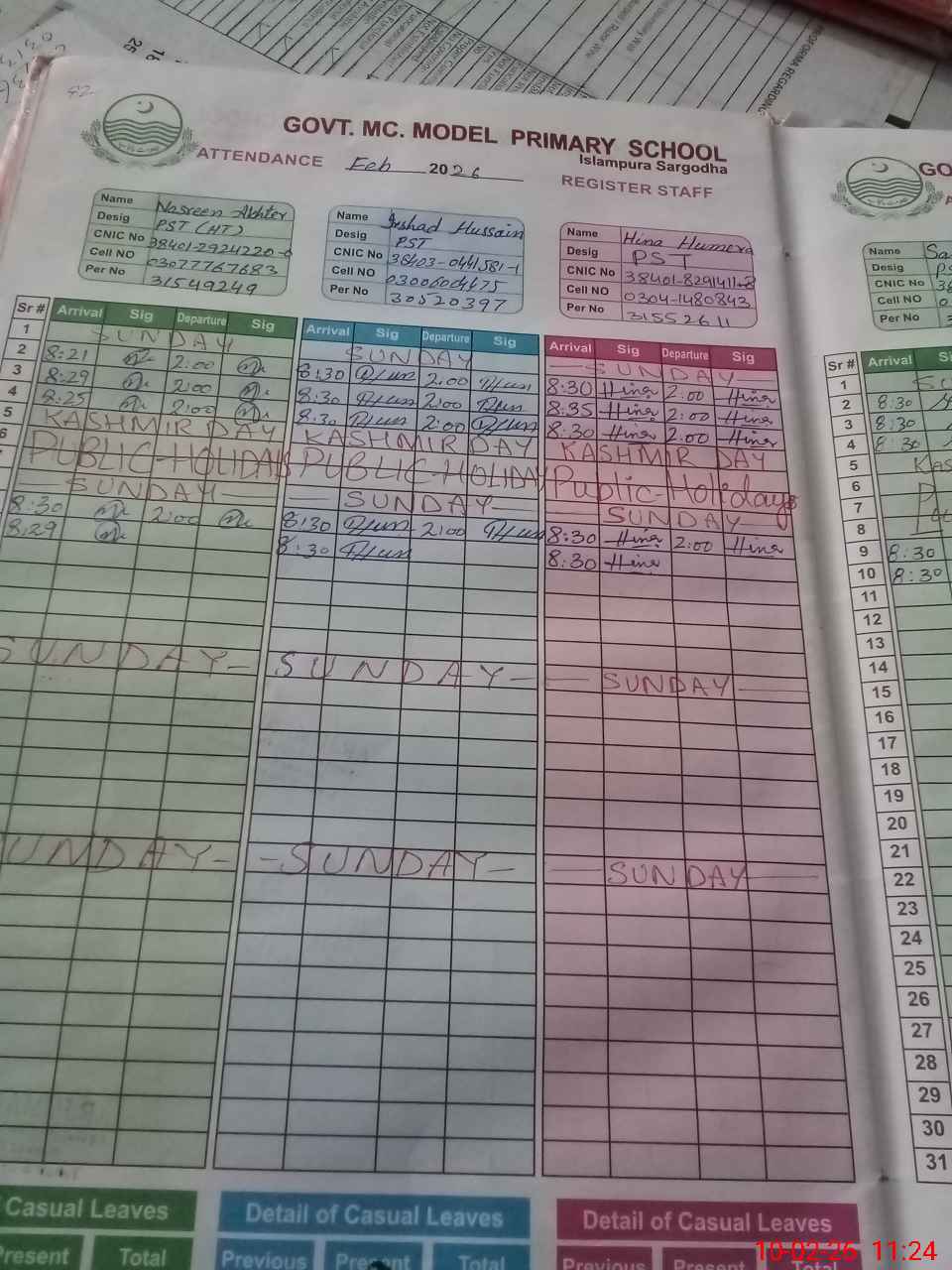 | CNIC | Full Name | Designation | R/C | Absence During Last Calender Month |