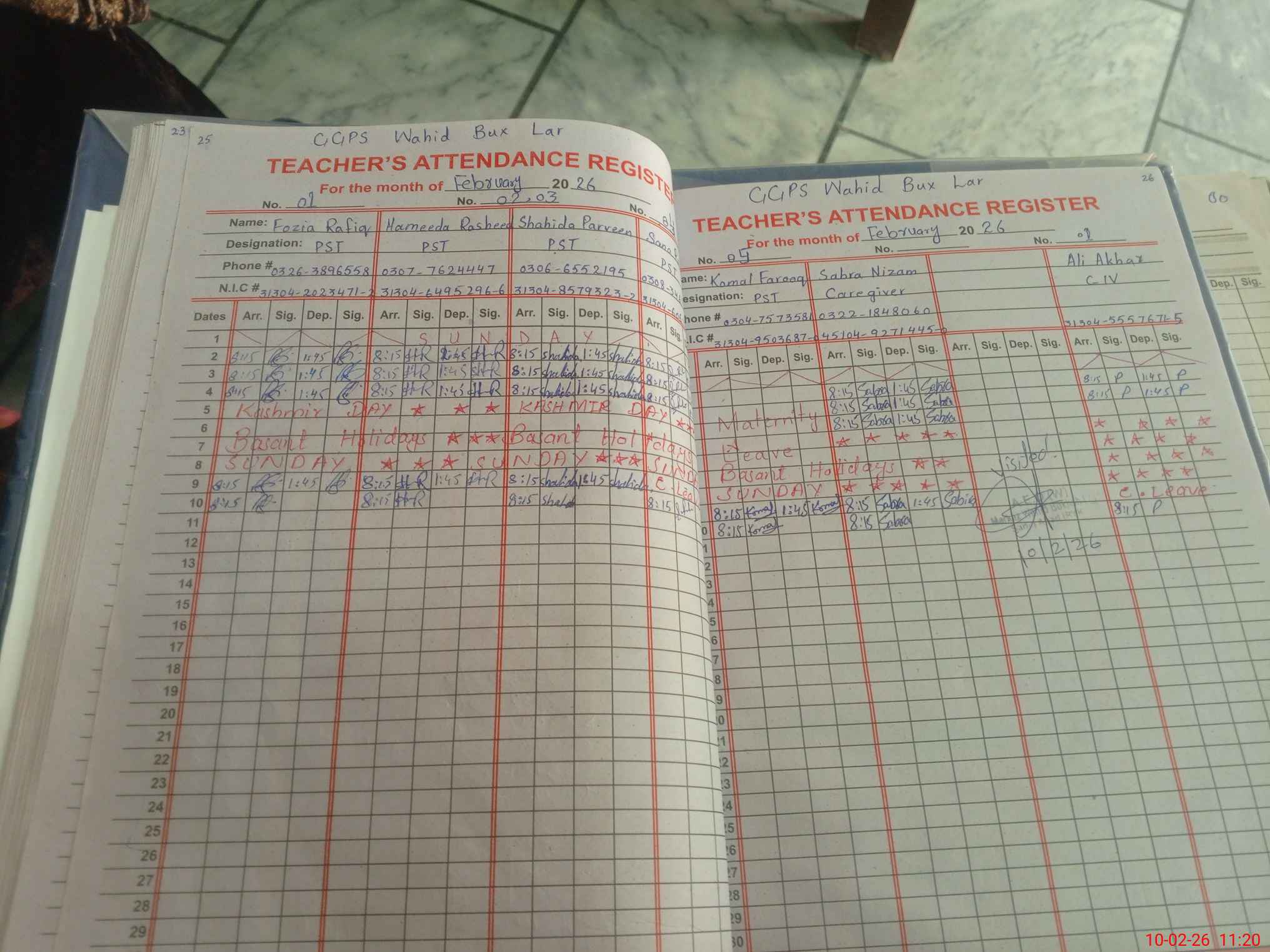 | CNIC | Full Name | Designation | R/C | Absence During Last Calender Month |