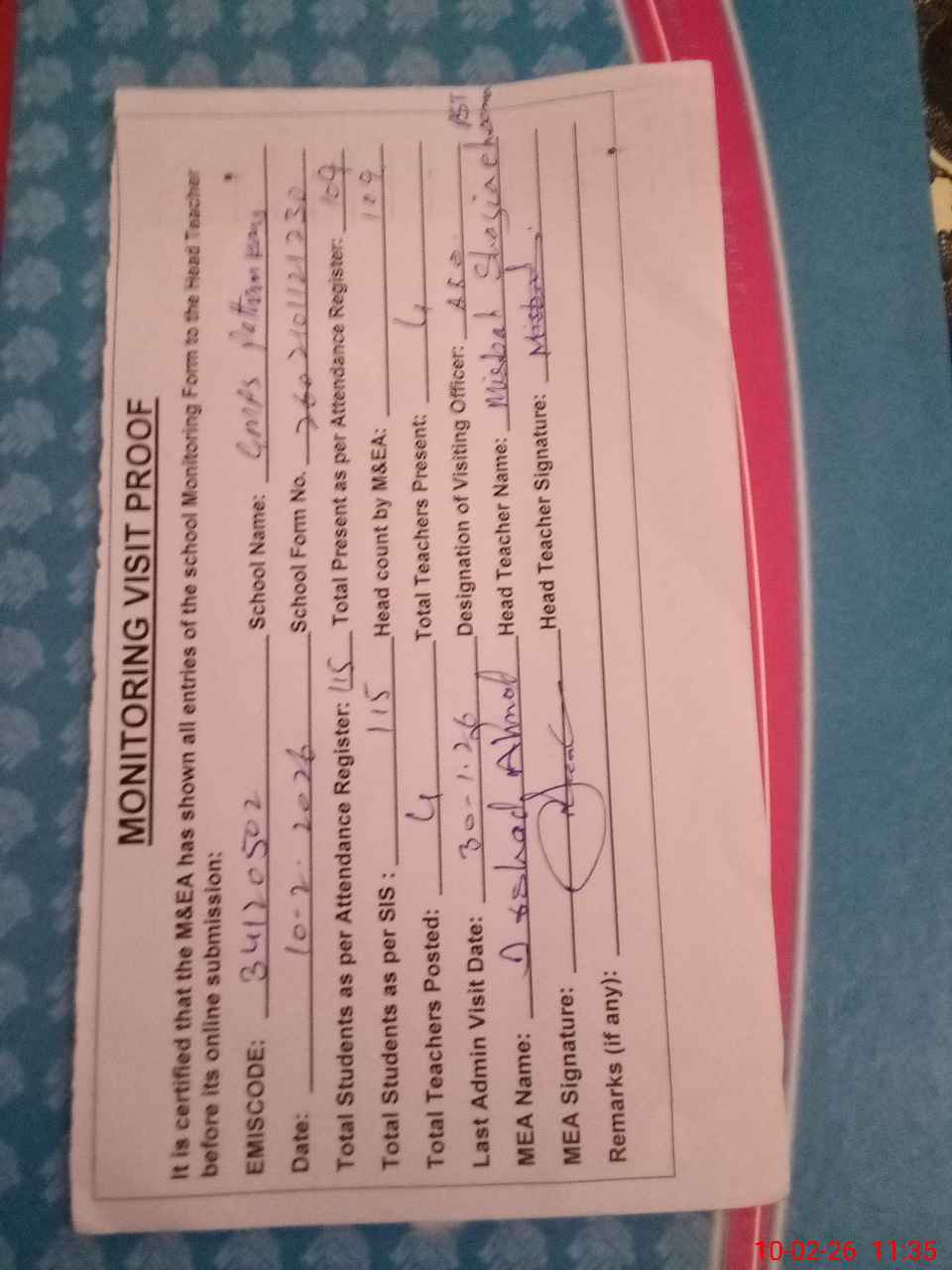 | Attendance Register | Head Teacher | MEA with School | Visit Proof |