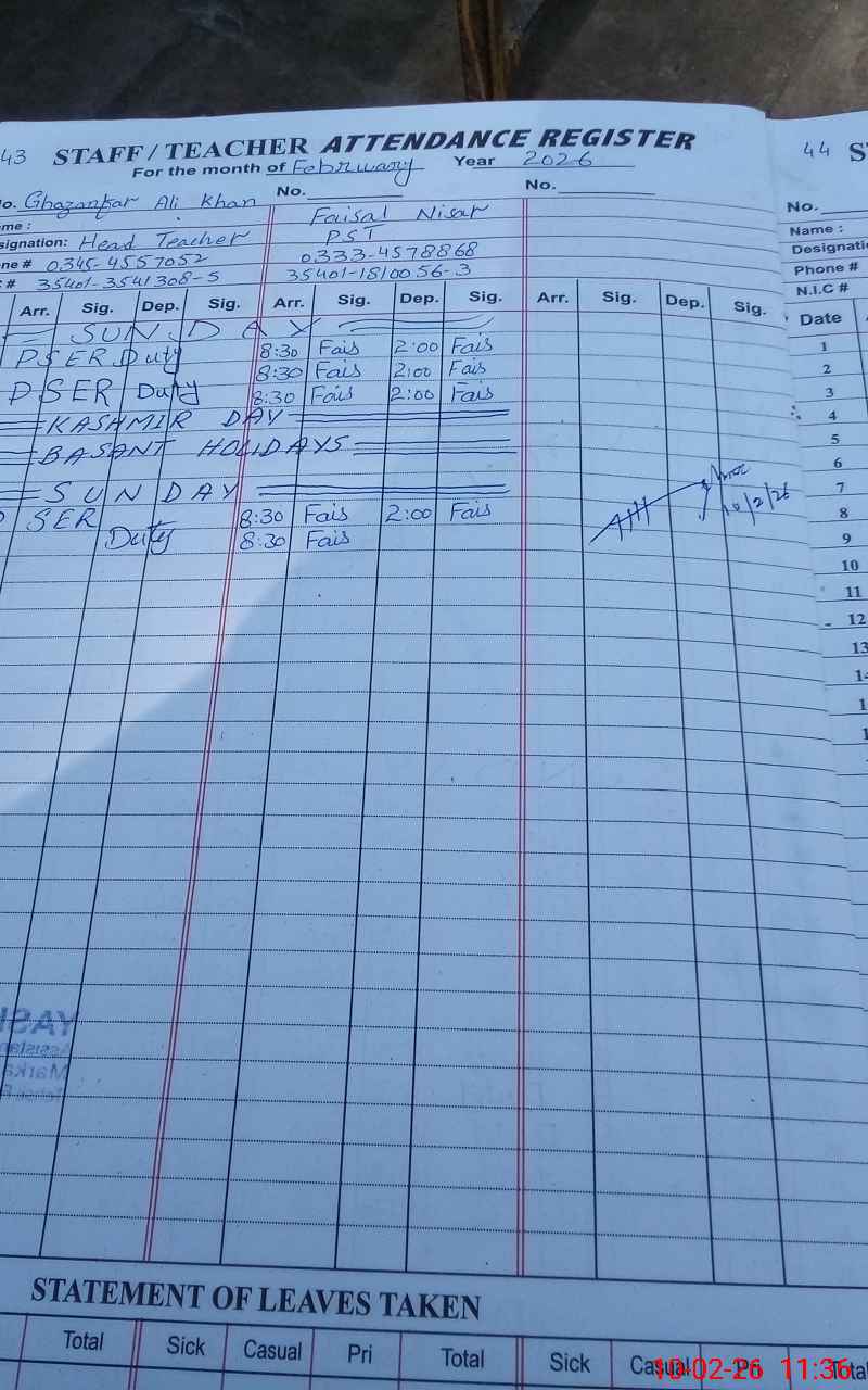 | Name: Gh**** Al**** Kh**** Designation: (School Headmaster's/Headmistress's) PST Phone/Cell Number: 03**** |