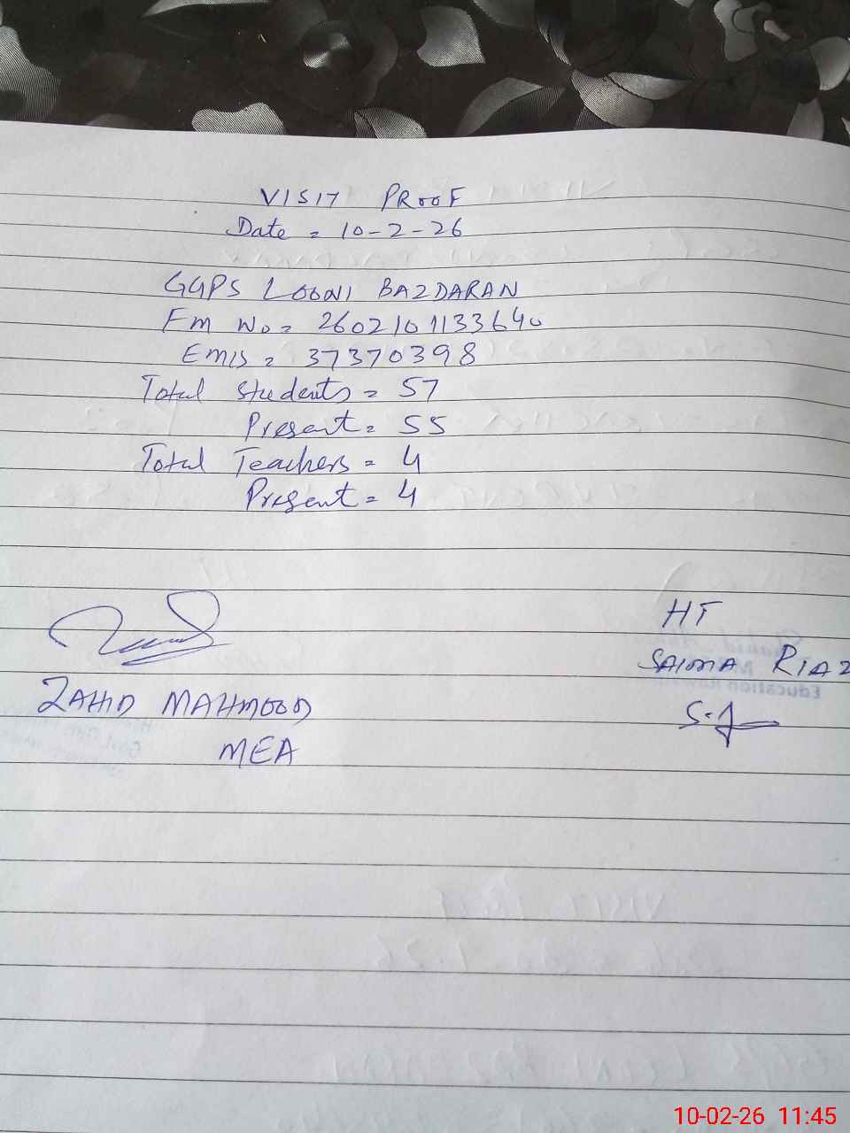| Monitoring Date: 10-02-2026 | Start Time: 10-02-2026 11:29 AM | End Time: 10-02-2026 11:47 AM | Name of MEA: Za**** Me**** | |