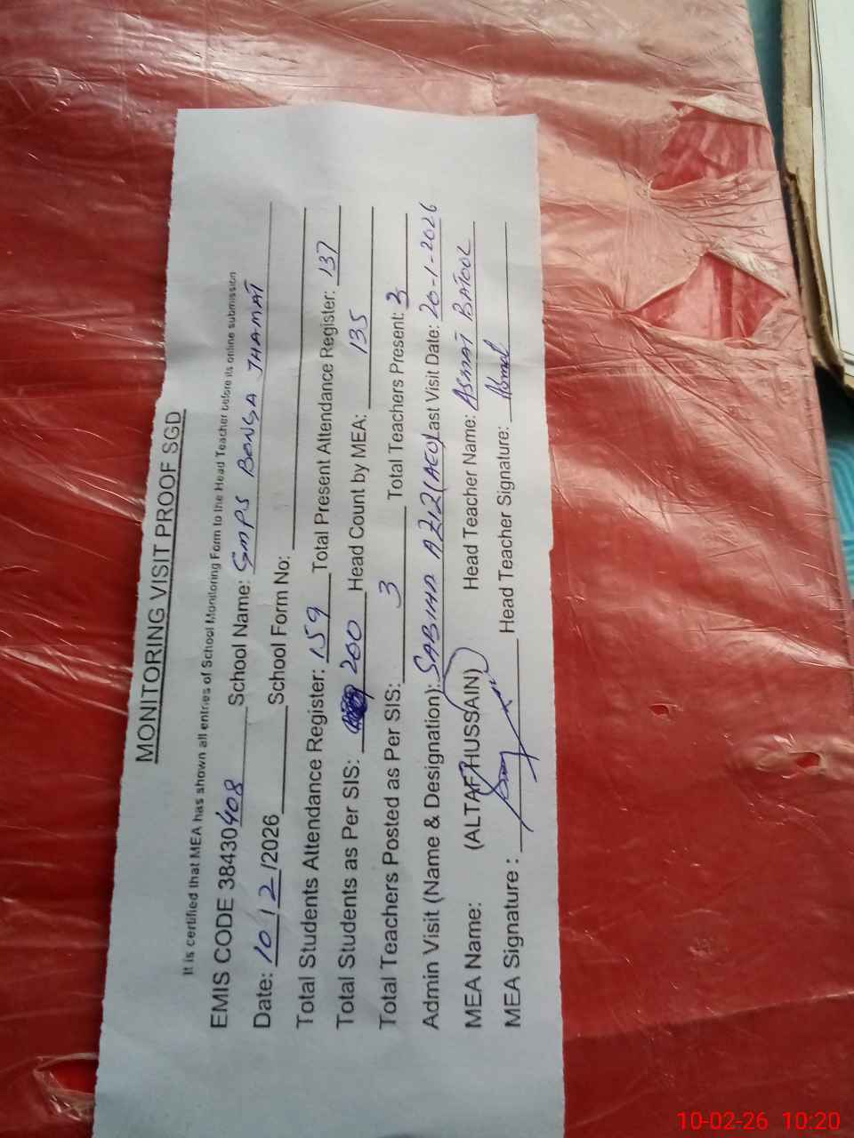 | Attendance Register | Head Teacher | MEA with School | Visit Proof |