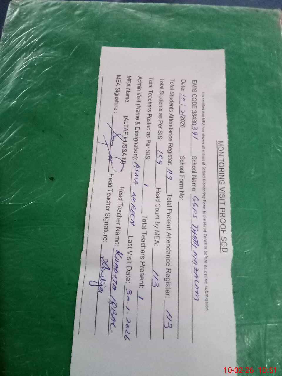 | Monitoring Date: 10-02-2026 | Start Time: 10-02-2026 10:36 AM | End Time: 10-02-2026 10:51 AM | Name of MEA: AL**** HU**** | |