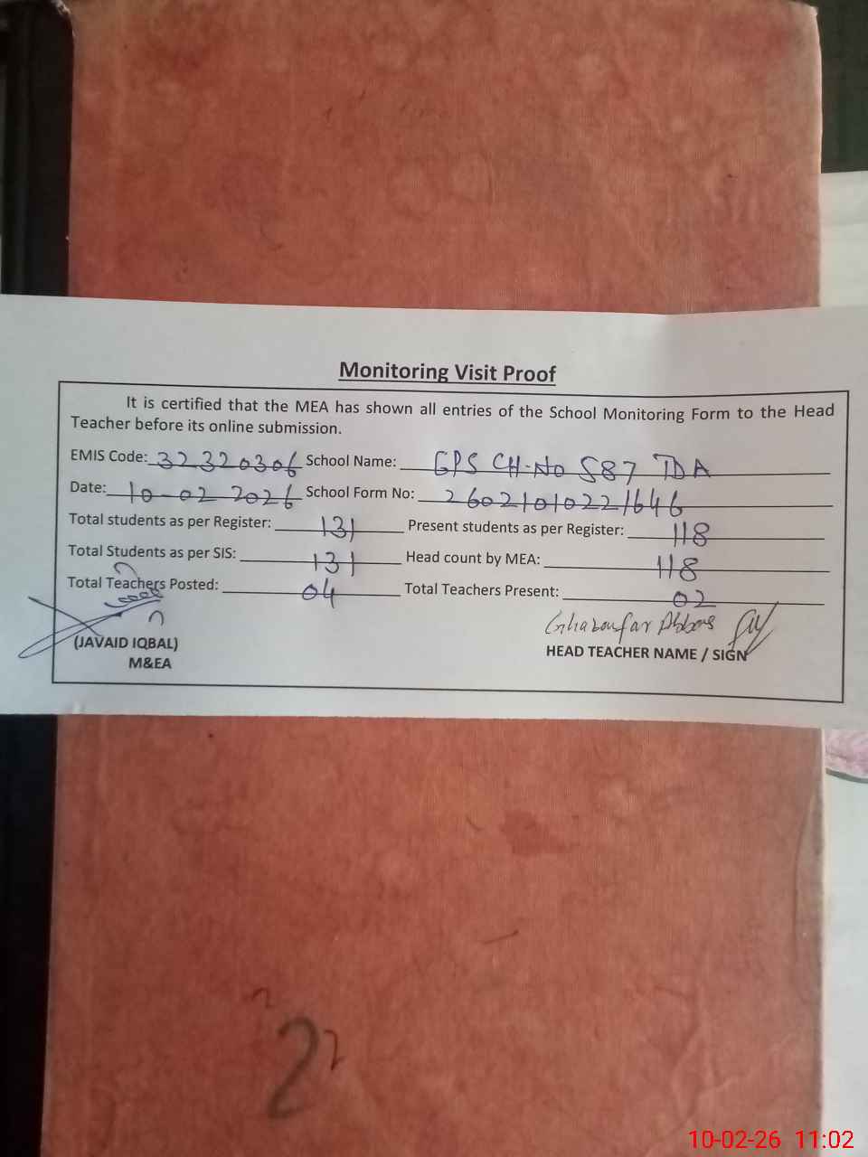 | Attendance Register | Head Teacher | MEA with School | Visit Proof |