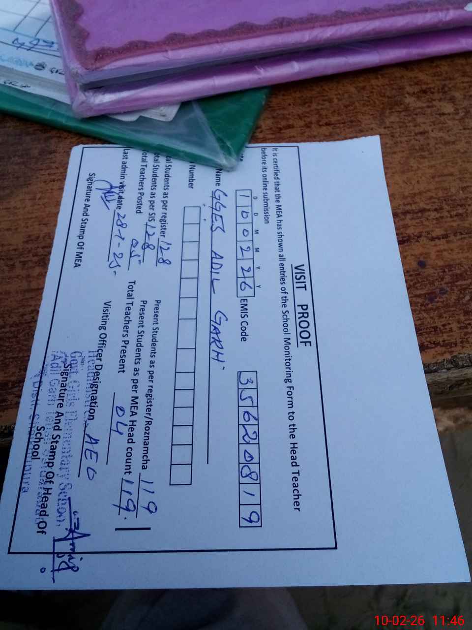 | Attendance Register | Head Teacher | MEA with School | Visit Proof |