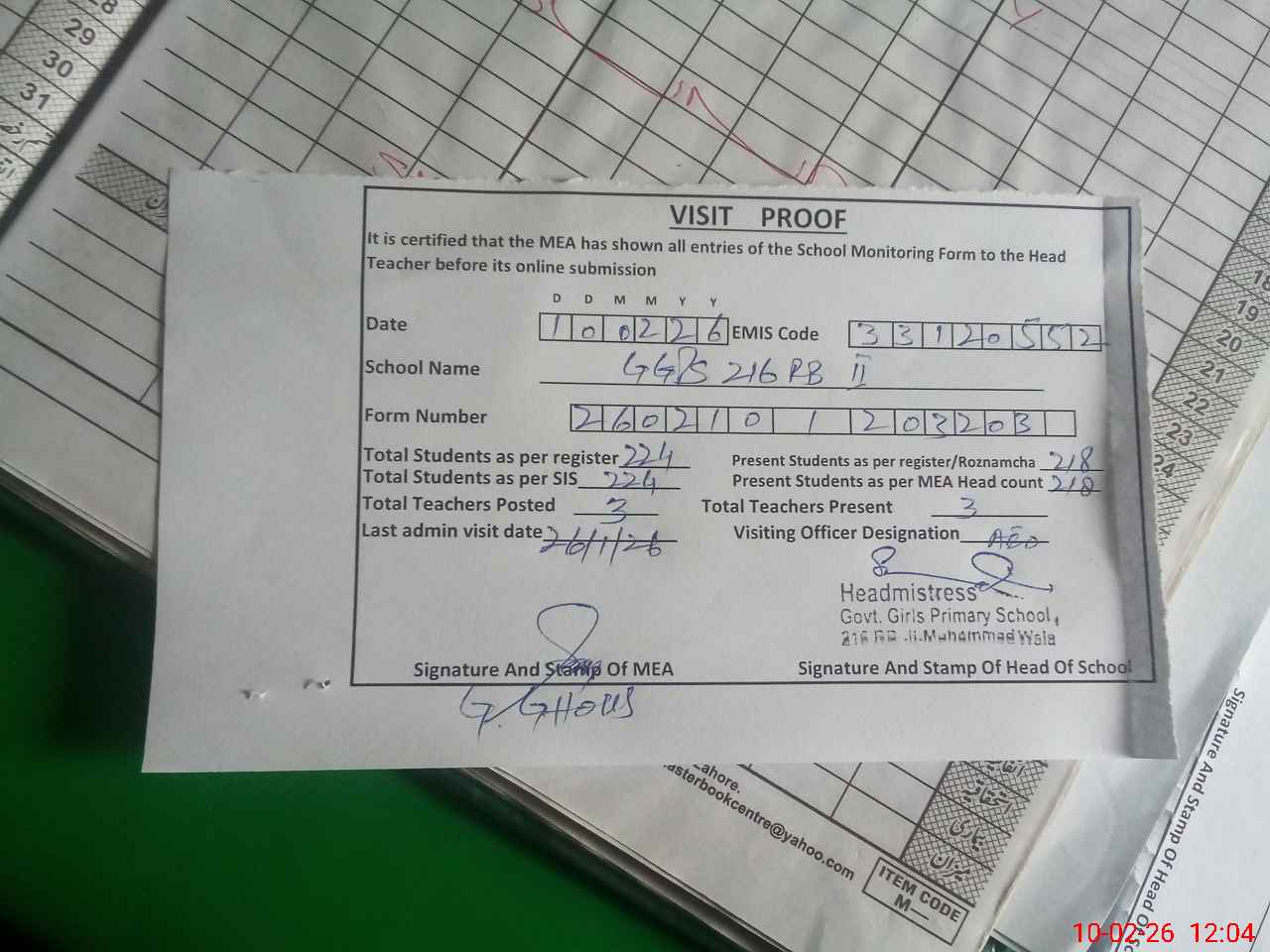 | Attendance Register | Head Teacher | MEA with School | Visit Proof |