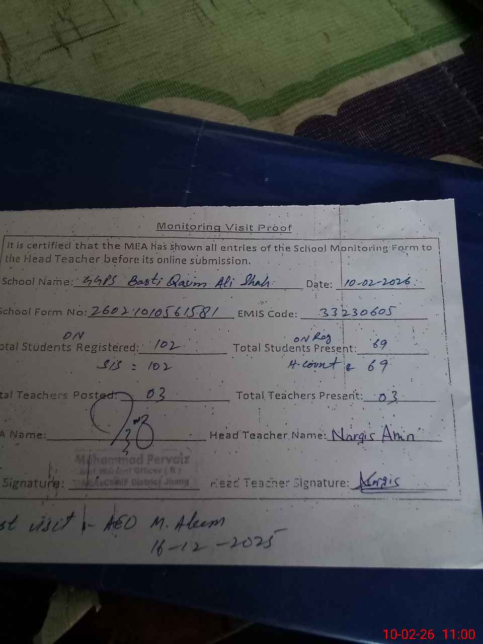 | Attendance Register | Head Teacher | MEA with School | Visit Proof |