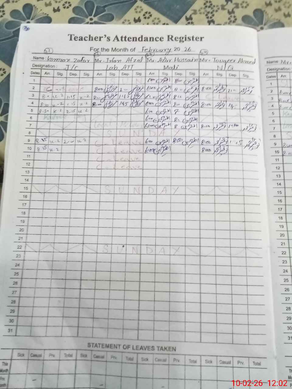 | CNIC | Full Name | Designation | R/C | Absence During Last Calender Month |