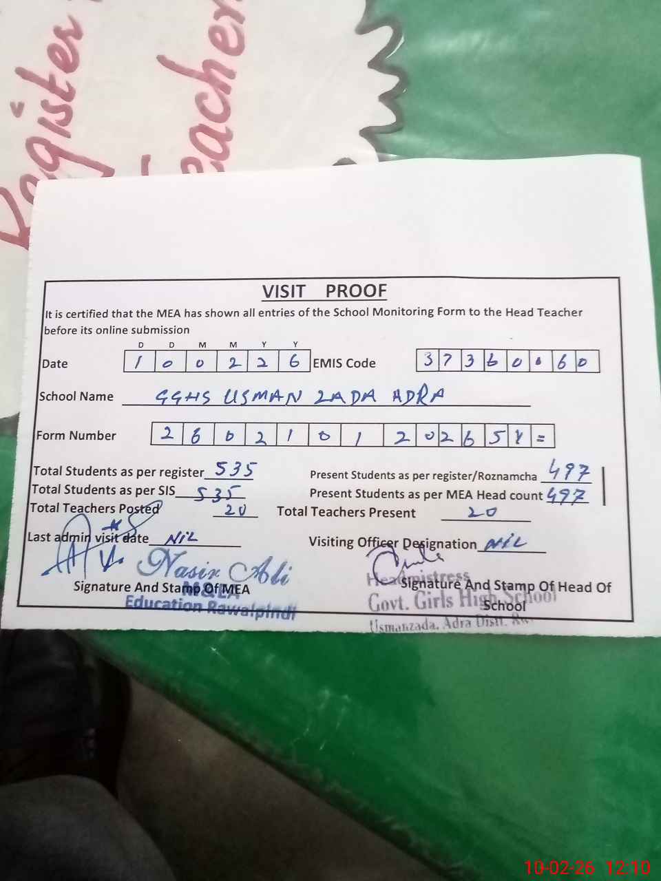 | Attendance Register | Head Teacher | MEA with School | Visit Proof |