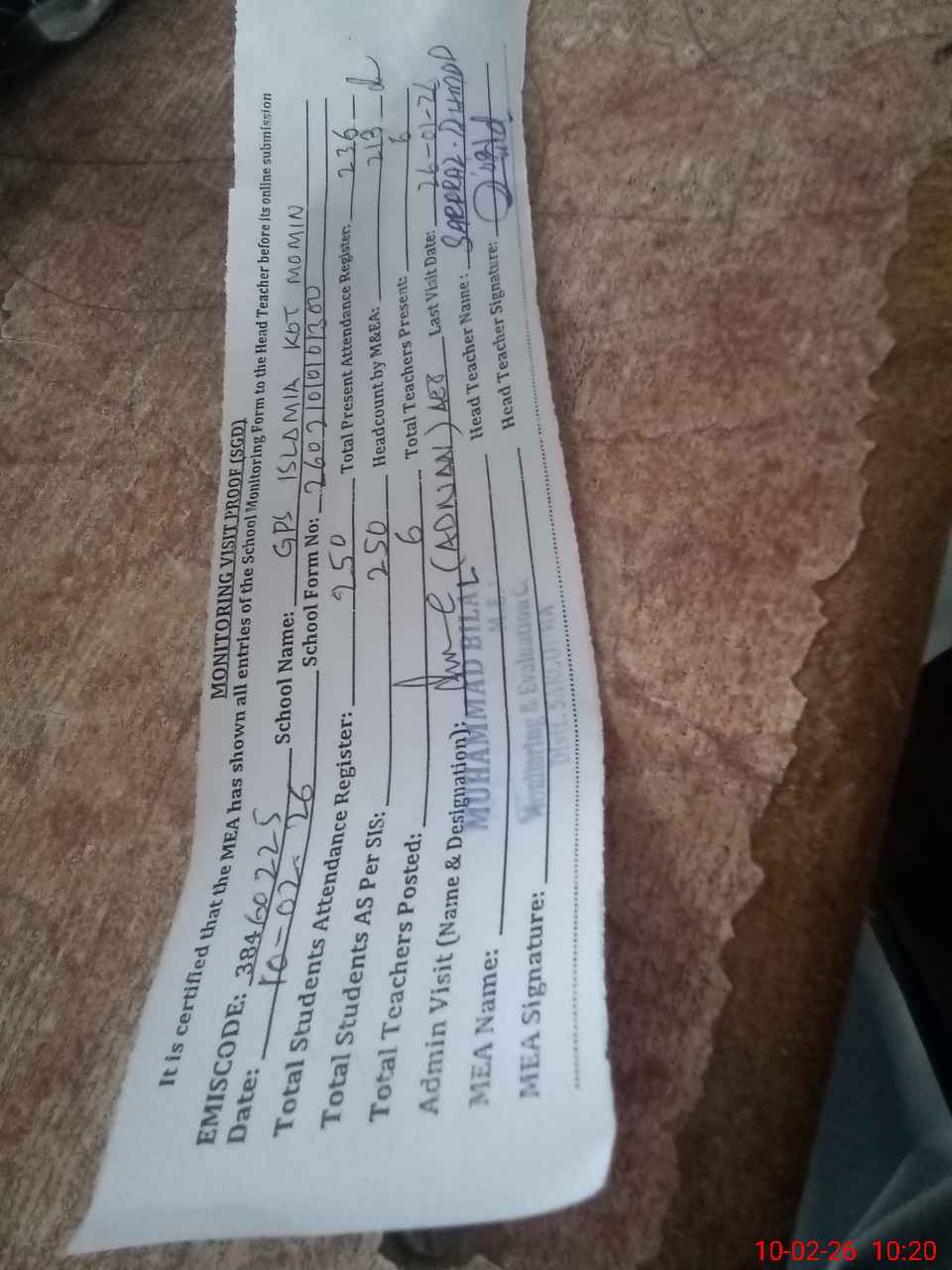 | Attendance Register | Head Teacher | MEA with School | Visit Proof |