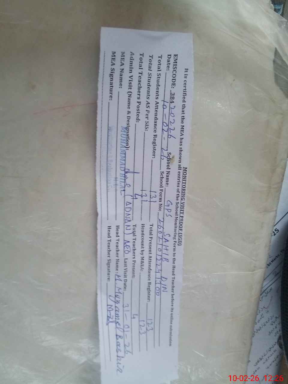 | Attendance Register | Head Teacher | MEA with School | Visit Proof |