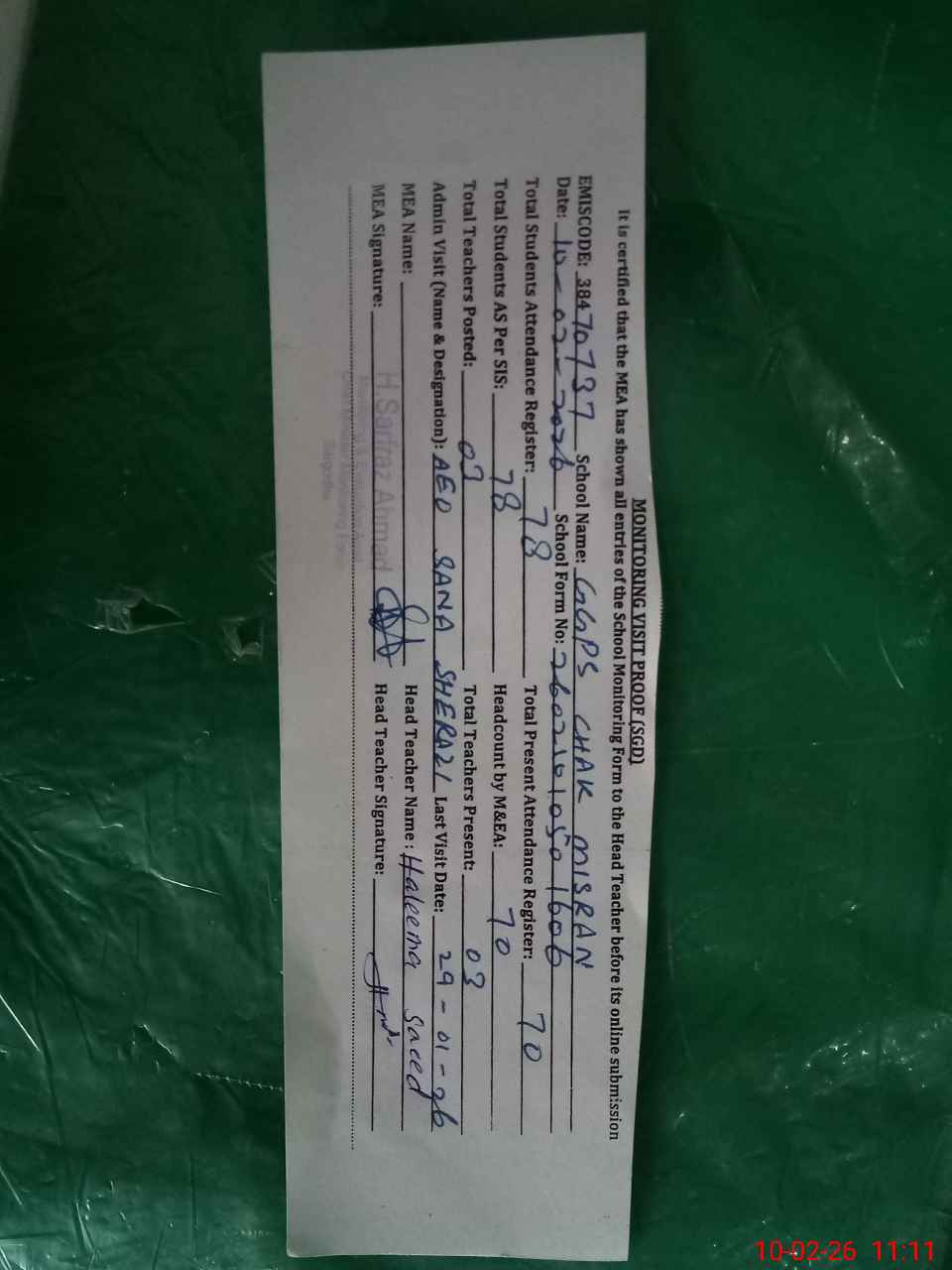 | Monitoring Date: 10-02-2026 | Start Time: 10-02-2026 10:50 AM | End Time: 10-02-2026 11:11 AM | Name of MEA: HA**** SA**** AH**** | |