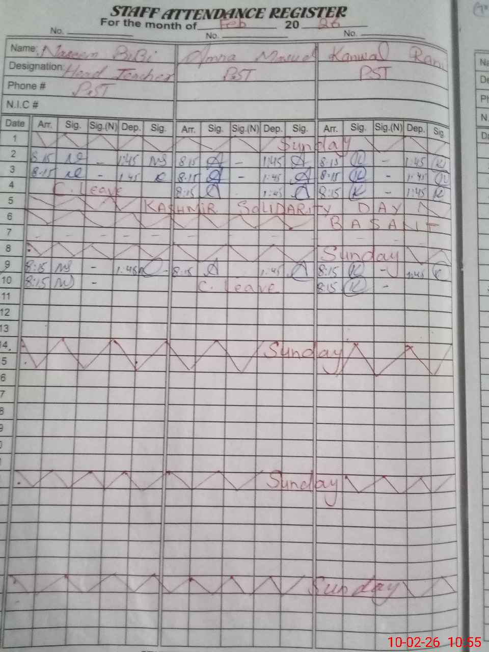 | Total no. of Classrooms: 3 No. of Classrooms Used for Teaching: 1 No. of Classrooms Storing Old Furniture, FTBs, etc: 0Comments if Any: Cash book not maintained Barbed wire not installed Electric wiring found in very dangerous condition |