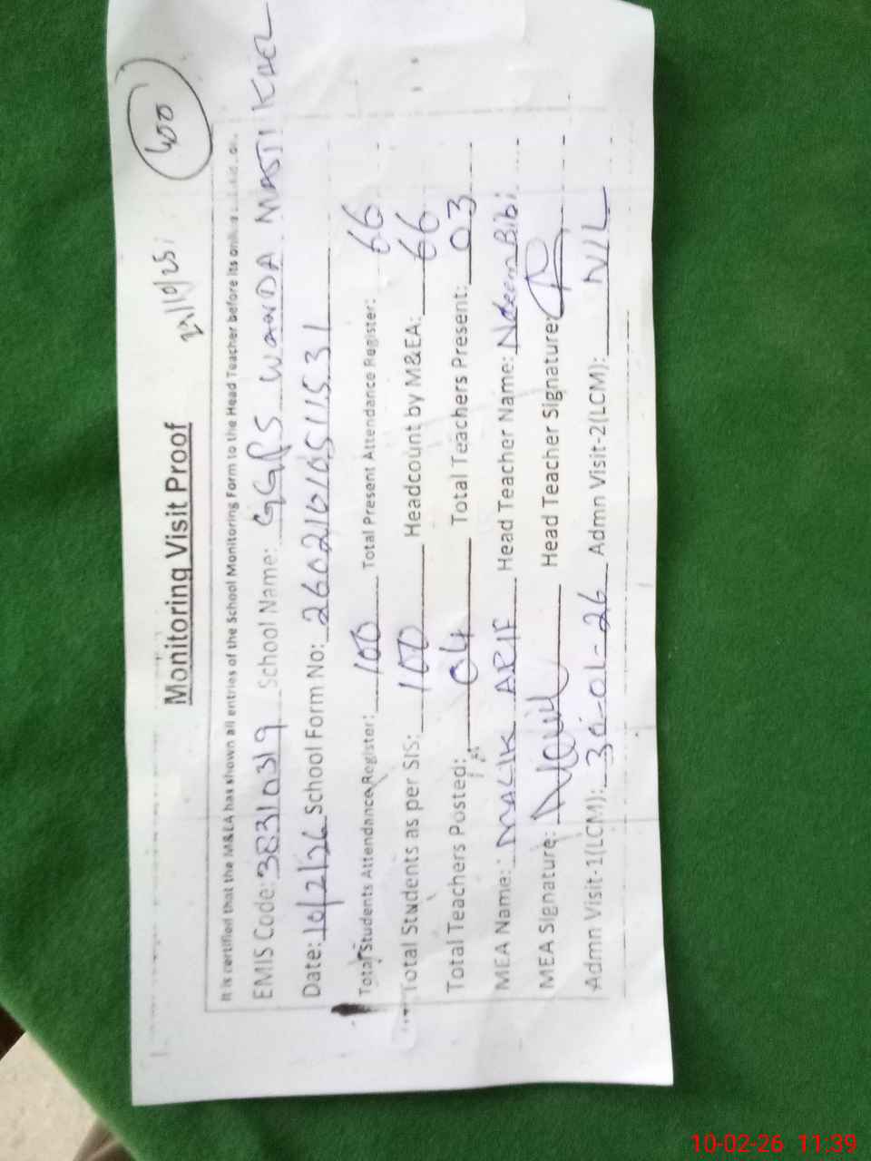 | Certified that this School was Inspected by the Undersigned MEA/DMO Today and the Information Stated Above is as Per Record. | |||||