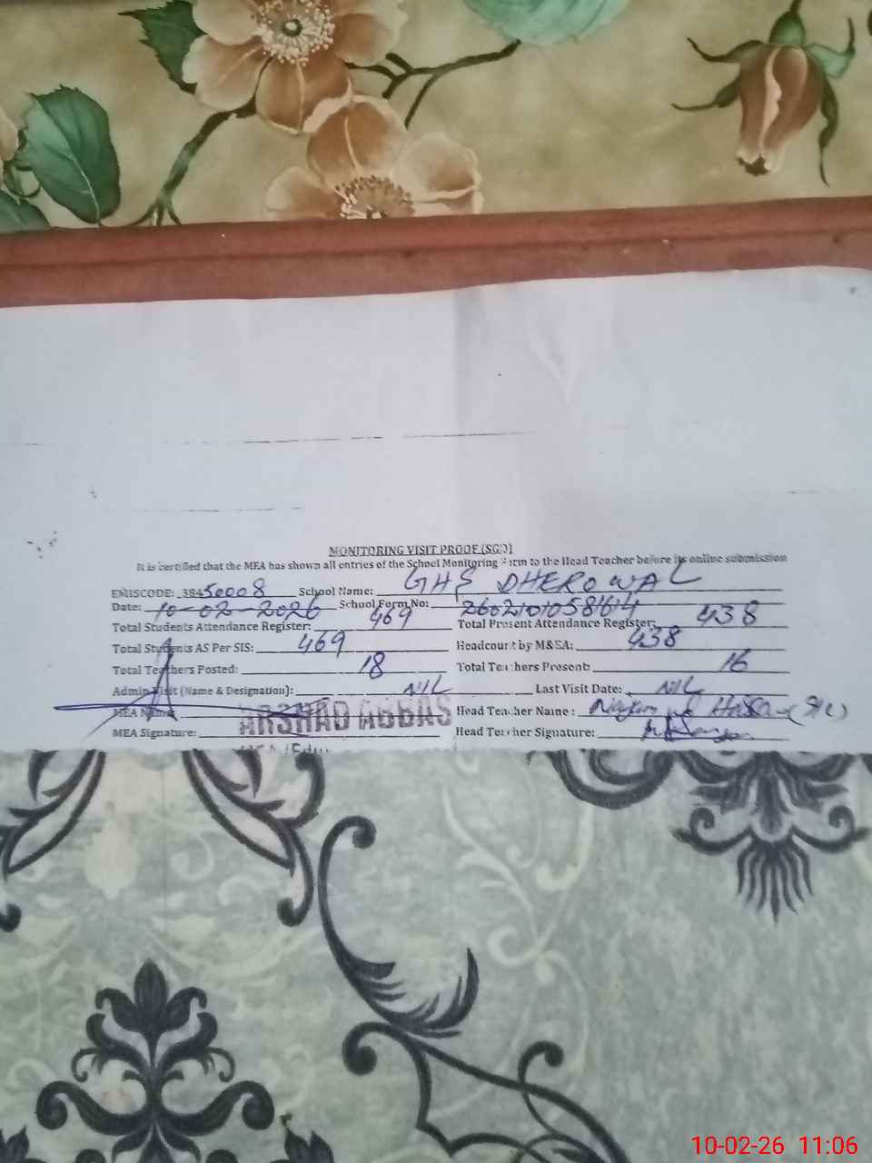 | Certified that this School was Inspected by the Undersigned MEA/DMO Today and the Information Stated Above is as Per Record. | |||||