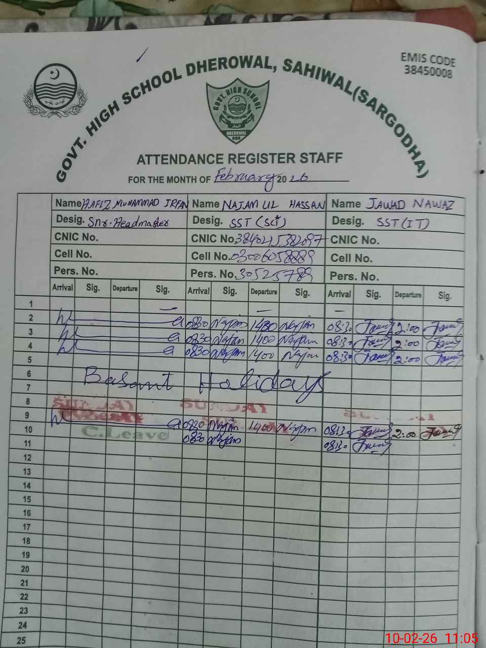 | CNIC | Full Name | Designation | R/C | Absence during last cal. month |