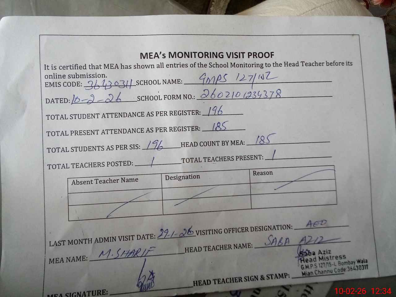 | Attendance Register | Head Teacher | MEA with School | Visit Proof |