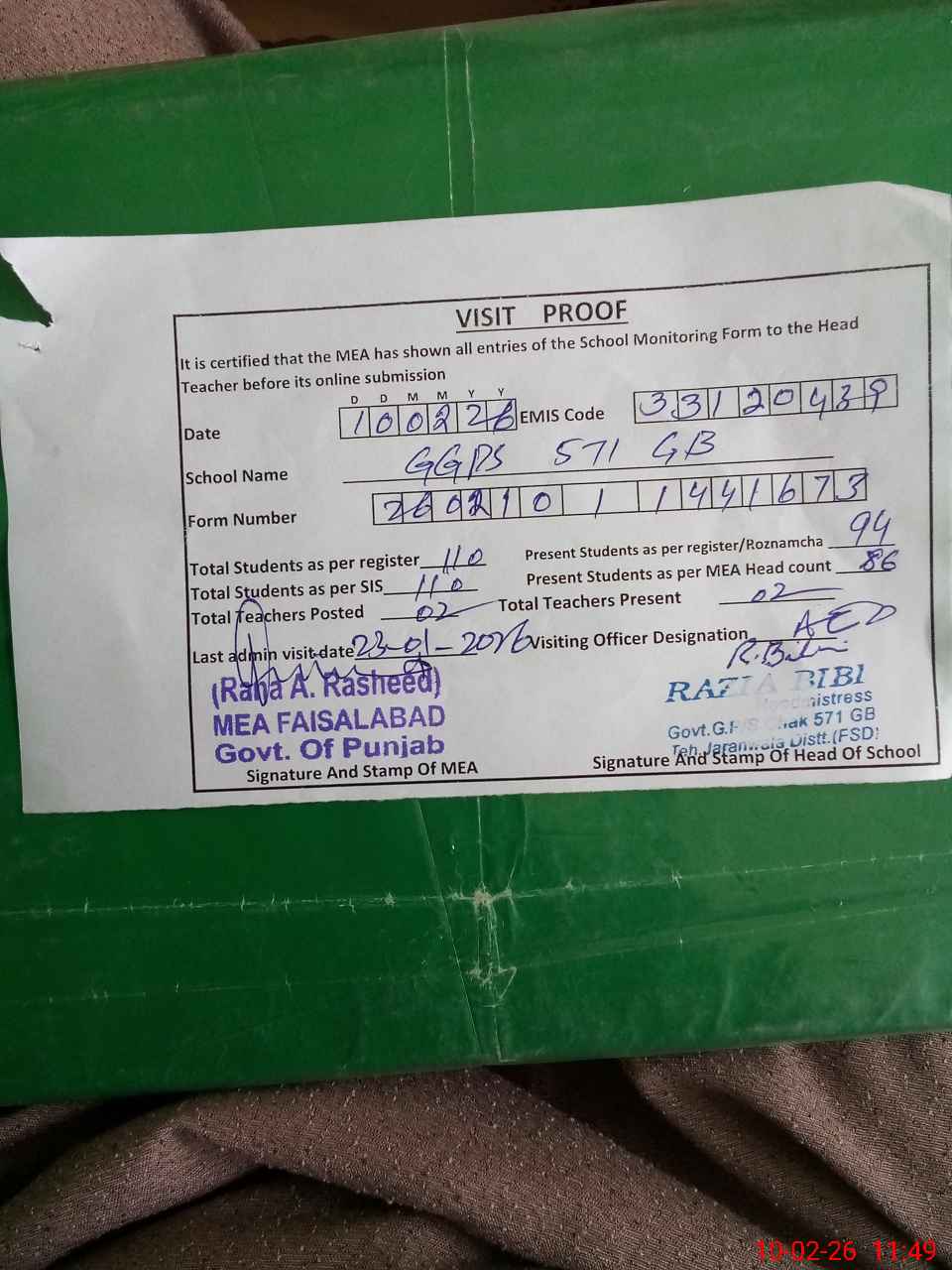 | EMIS Code: 33120439 | Name of School: GGPS CHAK 571 GB LUNDIANWALA | |||