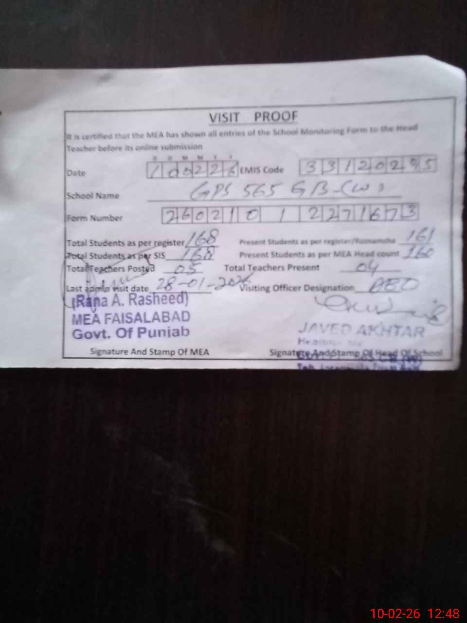 | Certified that this School was Inspected by the Undersigned MEA/DMO Today and the Information Stated Above is as Per Record. | |||||