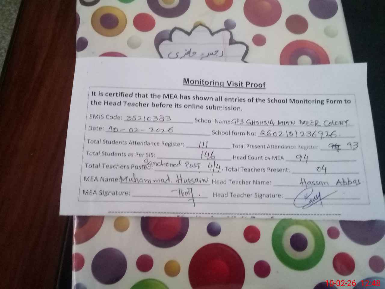 | Attendance Register | Head Teacher | MEA with School | Visit Proof |