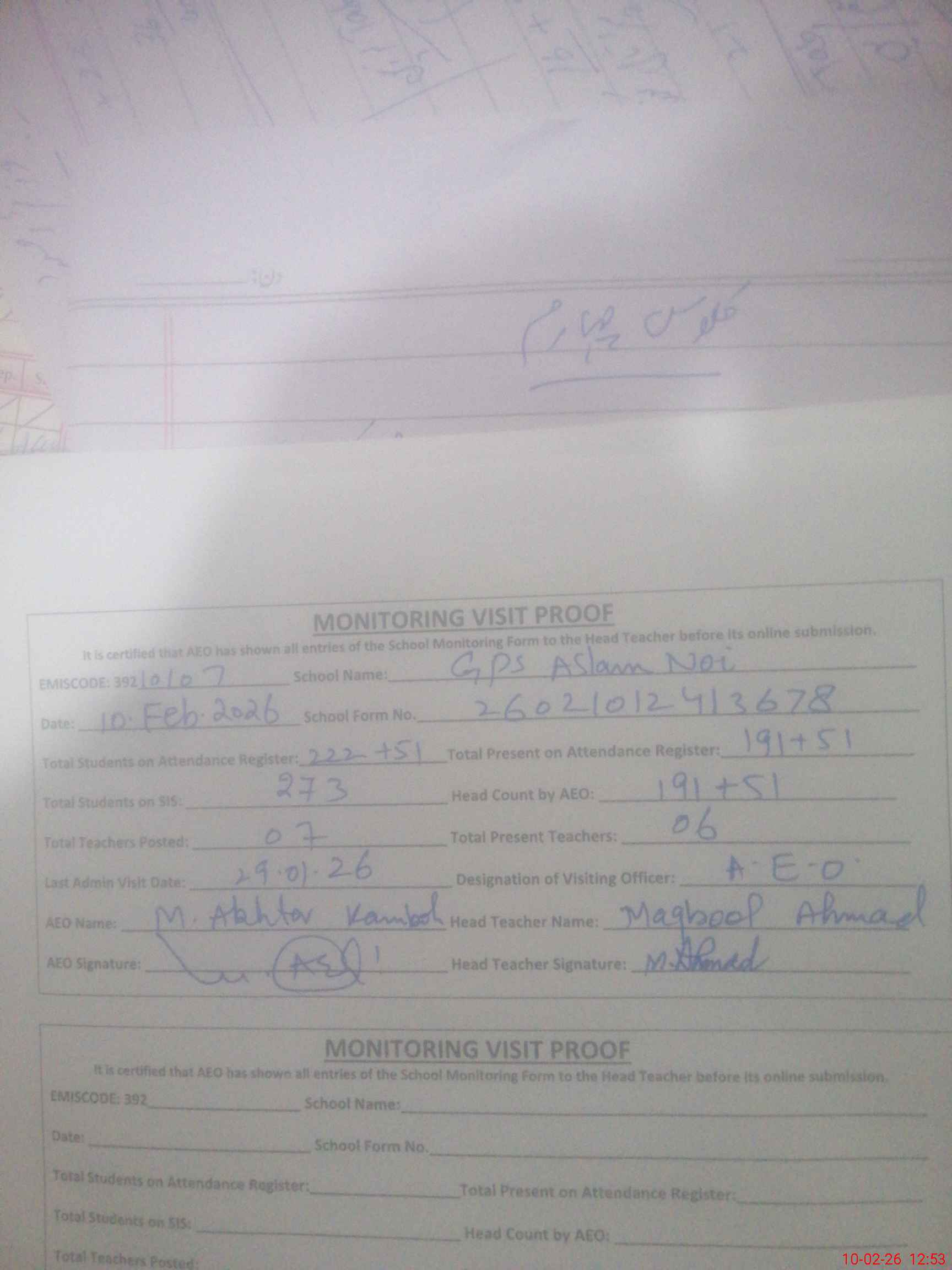 | EMIS Code: 39210107 | Name of School: GPS BASTI ASLAM NOI PAKPATTAN | |||