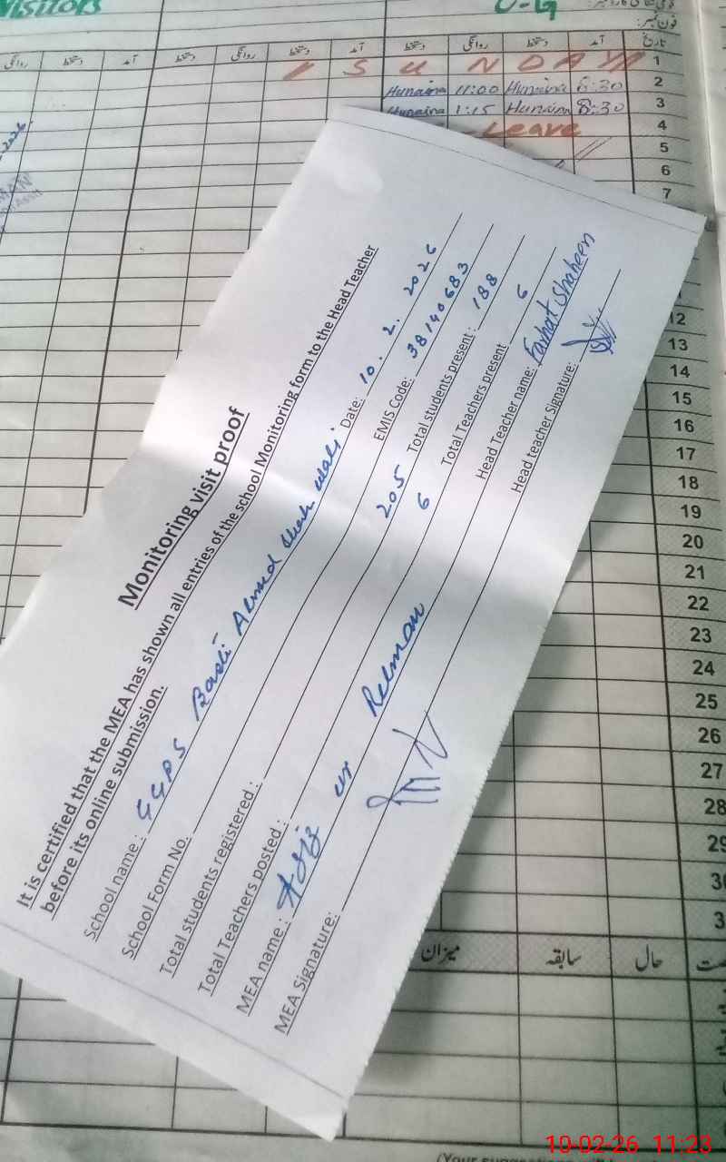 | Attendance Register | Head Teacher | MEA with School | Visit Proof |