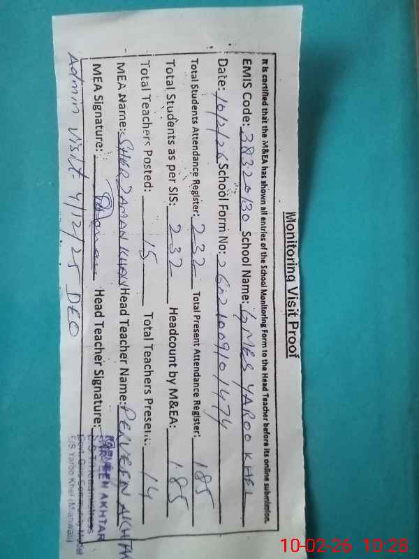 | EMIS Code: 38320130 | Name of School: GMES YAROO KHEL | |||