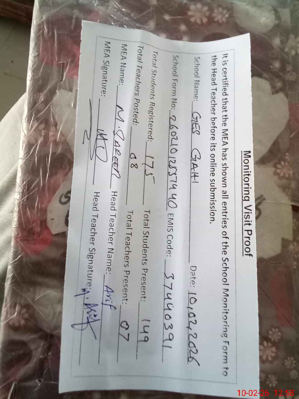 | Certified that this School was Inspected by the Undersigned MEA/DMO Today and the Information Stated Above is as Per Record. | |||||