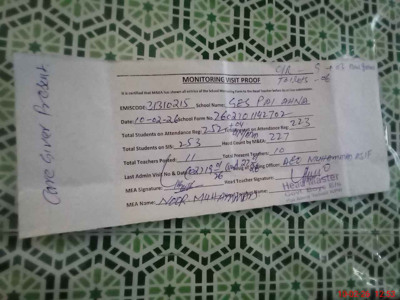 | Attendance Register | Head Teacher | MEA with School | Visit Proof |