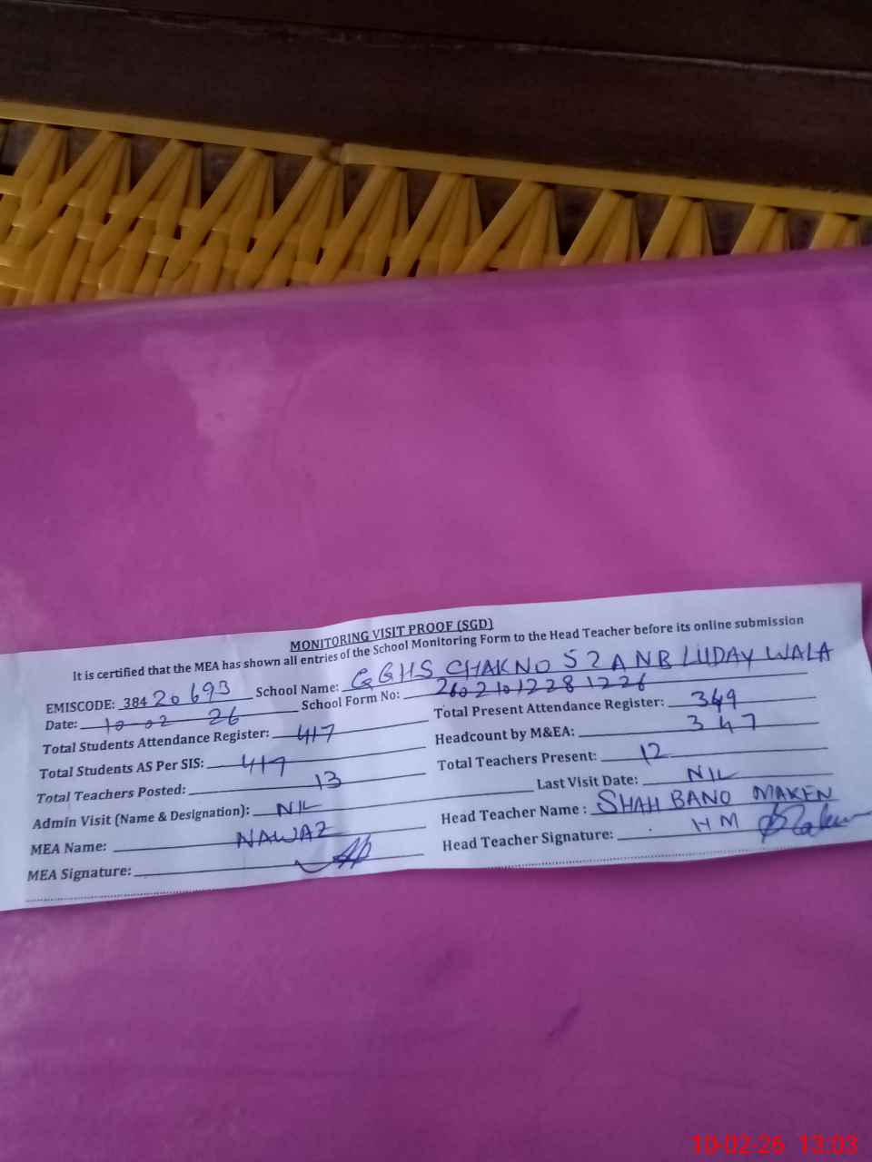 | Attendance Register | Head Teacher | MEA with School | Visit Proof |