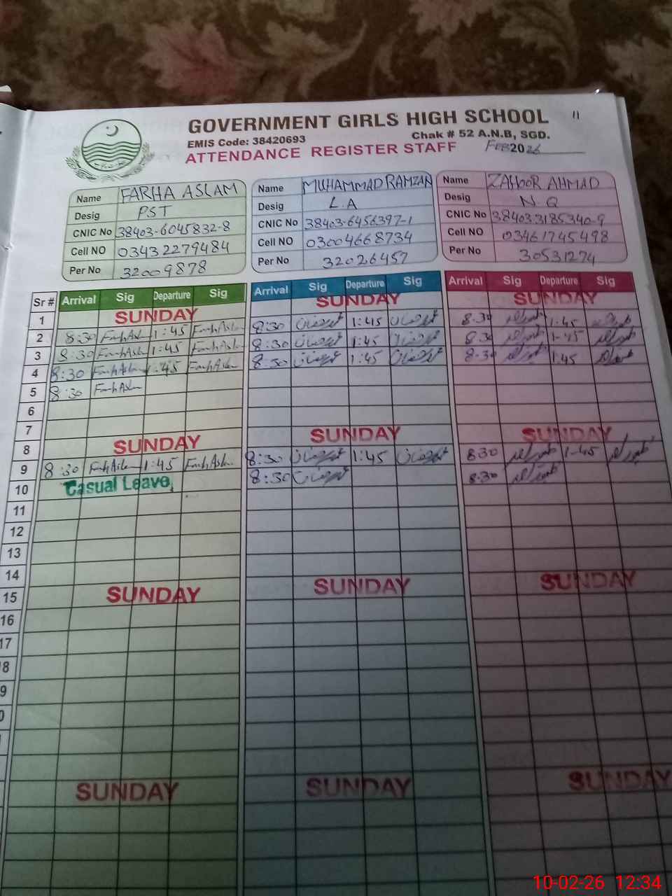 | CNIC | Full Name | Designation | R/C | Absence During Last Calender Month |