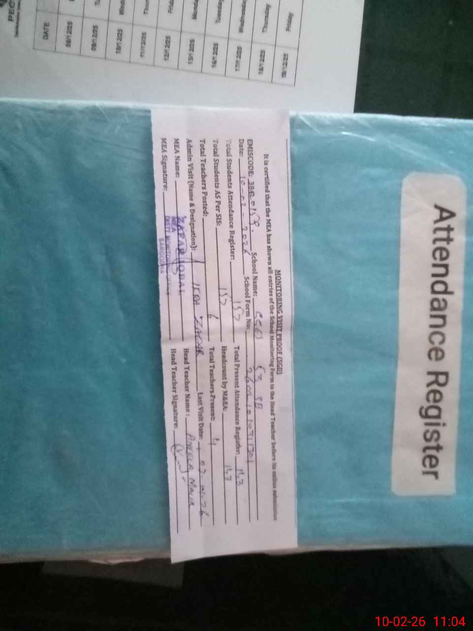 | Attendance Register | Head Teacher | MEA with School | Visit Proof |