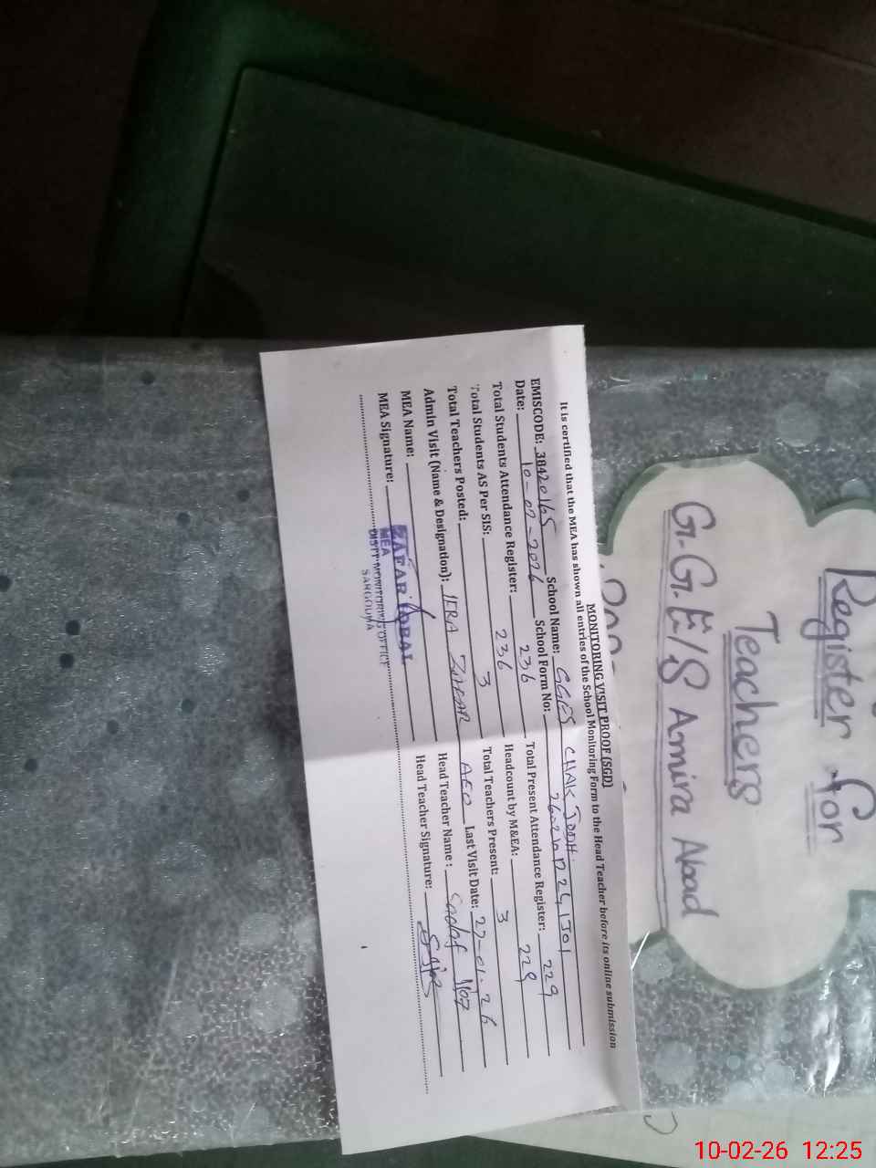 | Attendance Register | Head Teacher | MEA with School | Visit Proof |