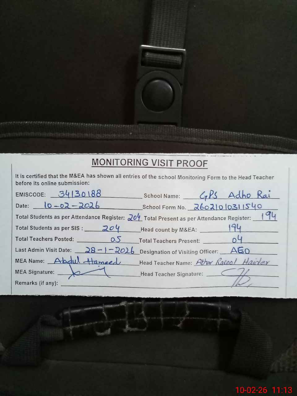 | Monitoring Date: 10-02-2026 | Start Time: 10-02-2026 10:31 AM | End Time: 10-02-2026 11:16 AM | Name of MEA: N-**** Ha**** | |
