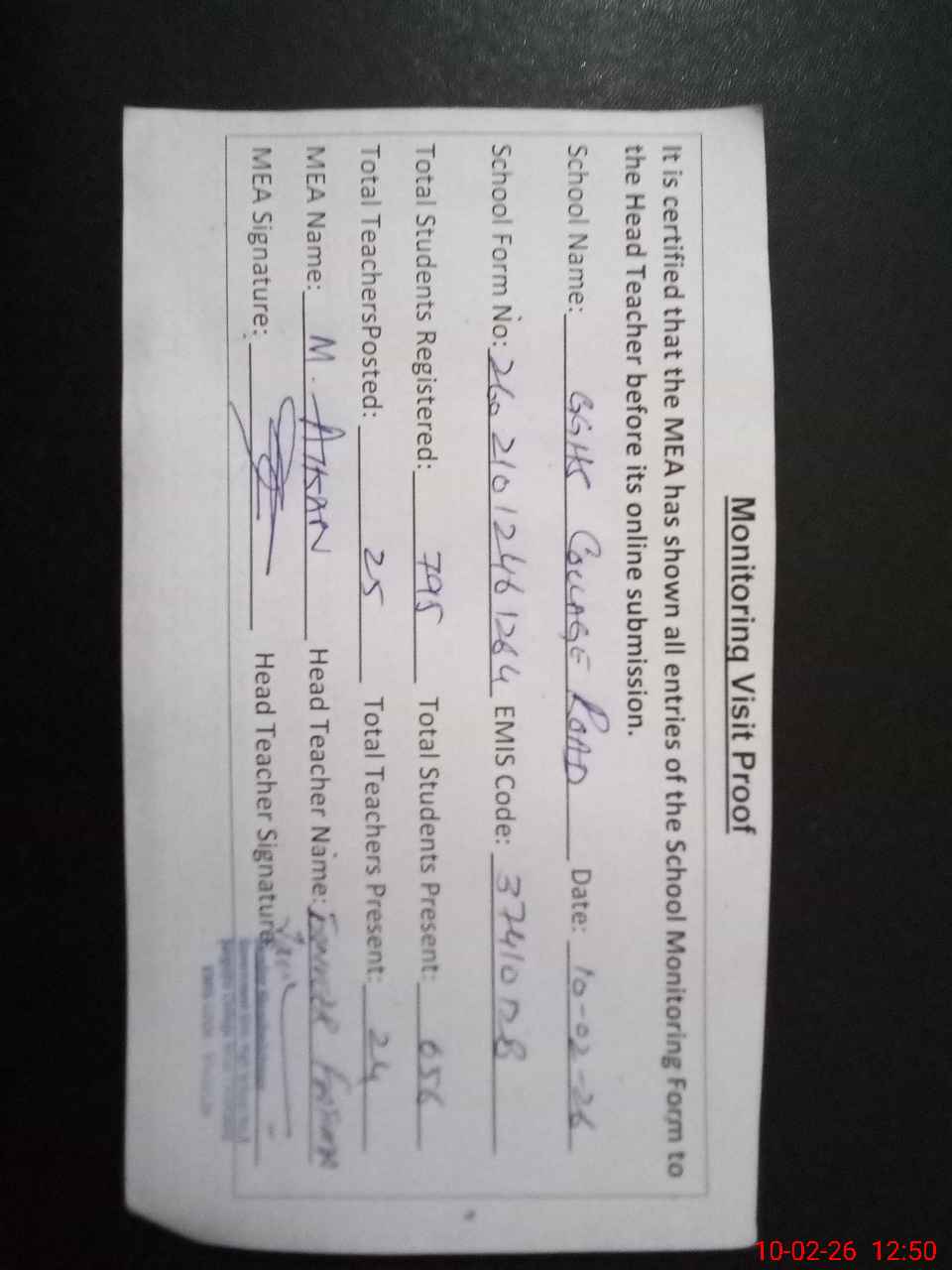 | Certified that this School was Inspected by the Undersigned MEA/DMO Today and the Information Stated Above is as Per Record. | |||||