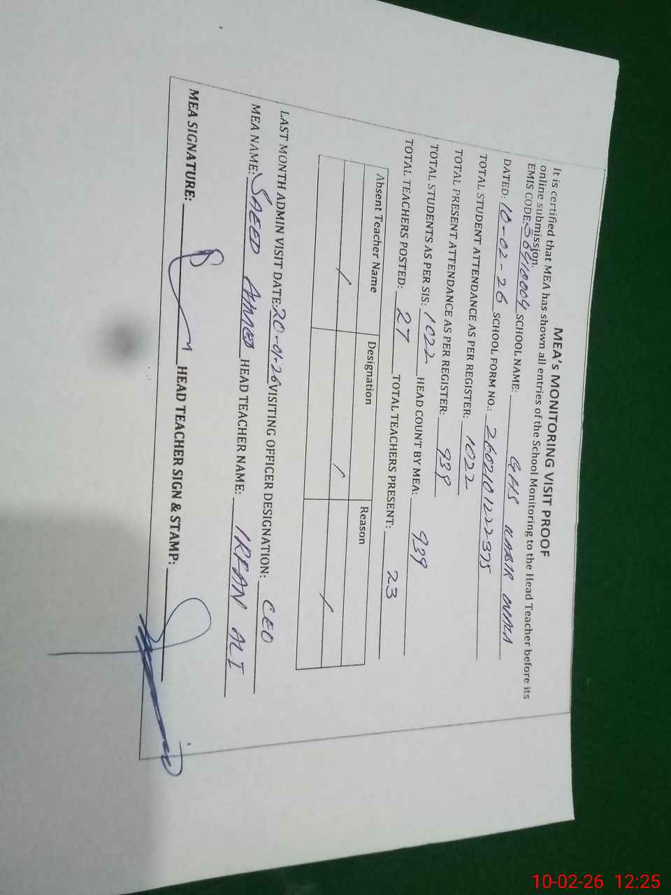 | Certified that this School was Inspected by the Undersigned MEA/DMO Today and the Information Stated Above is as Per Record. | |||||