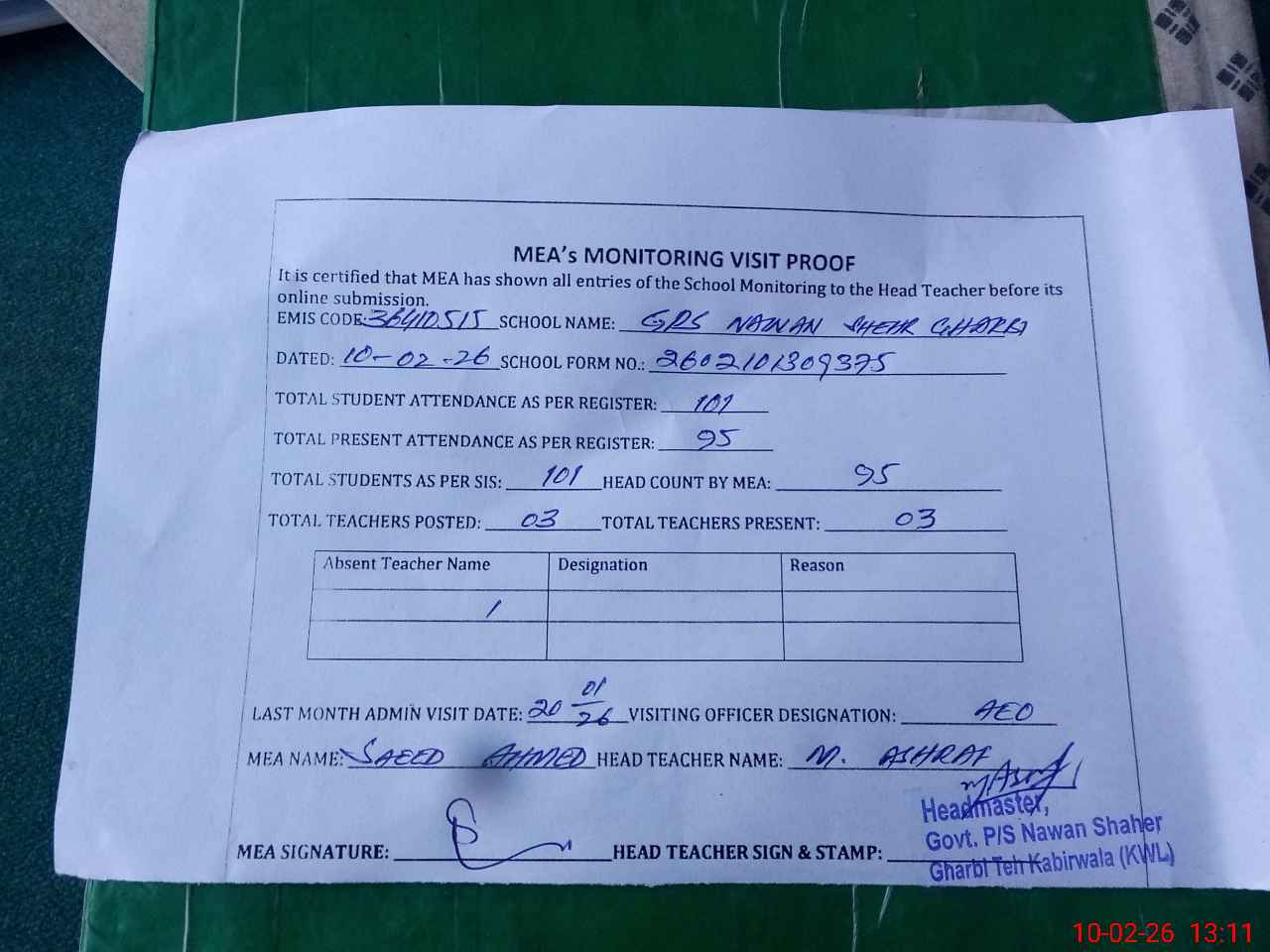 | EMIS Code: 36410515 | Name of School: GPS NAWAN SHEHR GHARBI, KABIRWALA | |||