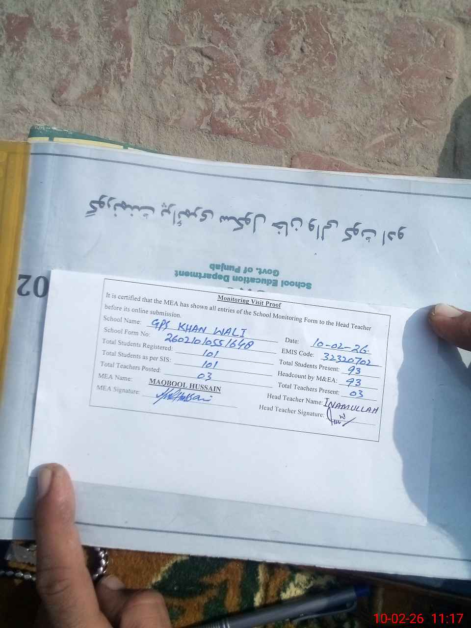 | Certified that this School was Inspected by the Undersigned MEA/DMO Today and the Information Stated Above is as Per Record. | |||||