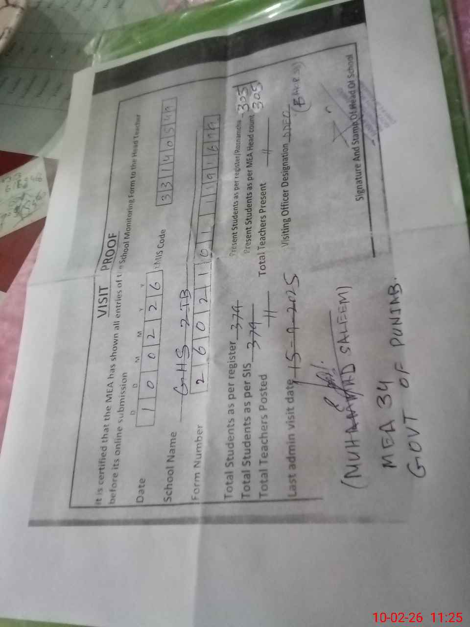 | Certified that this School was Inspected by the Undersigned MEA/DMO Today and the Information Stated Above is as Per Record. | |||||