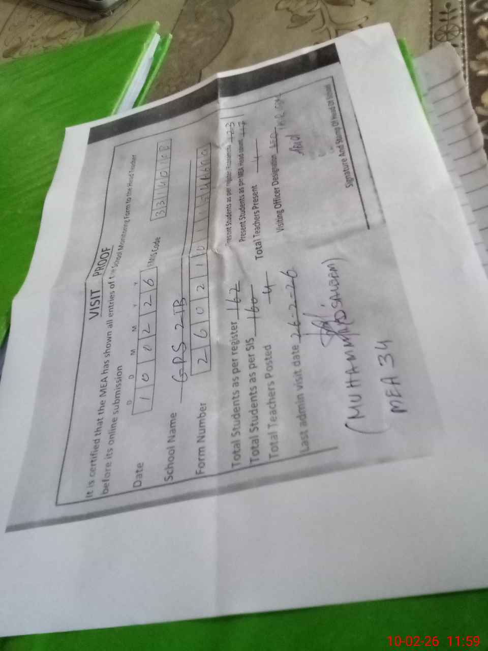 | Attendance Register | Head Teacher | MEA with School | Visit Proof |