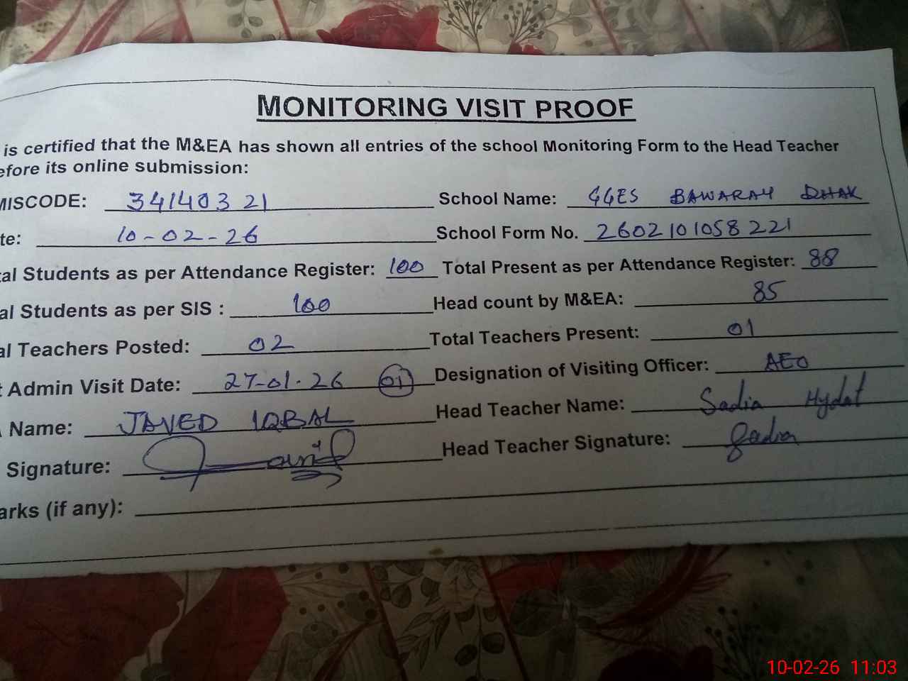 | Attendance Register | Head Teacher | MEA with School | Visit Proof |