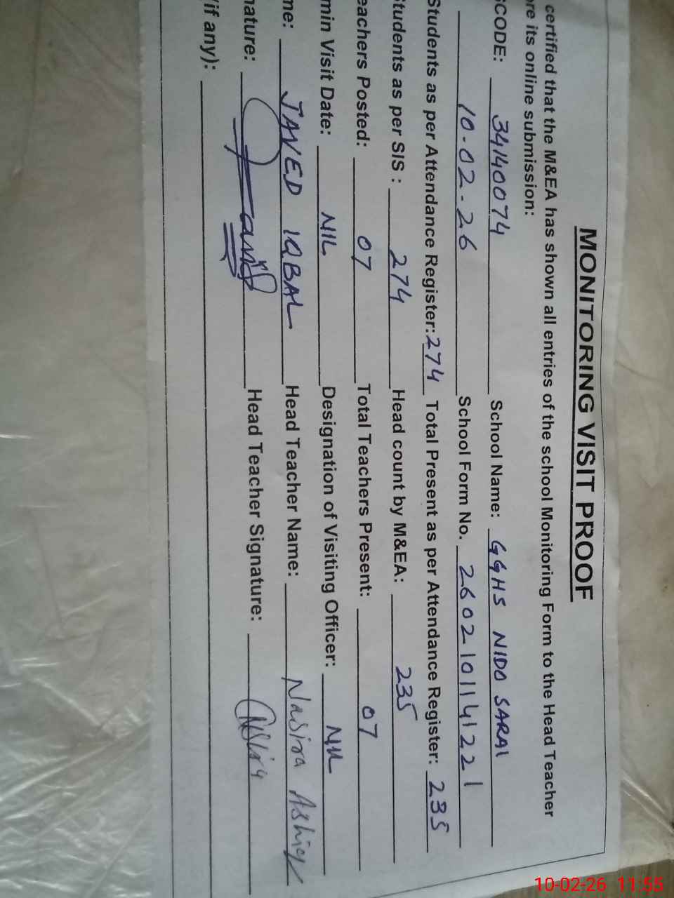 | Certified that this School was Inspected by the Undersigned MEA/DMO Today and the Information Stated Above is as Per Record. | |||||