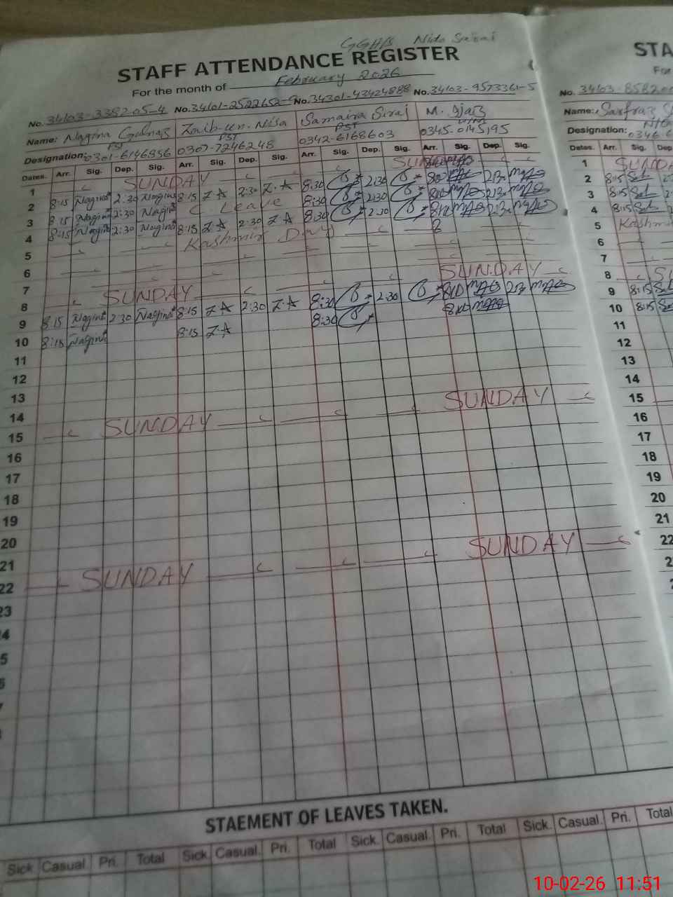 | CNIC | Full Name | Designation | R/C | Absence During Last Calender Month |