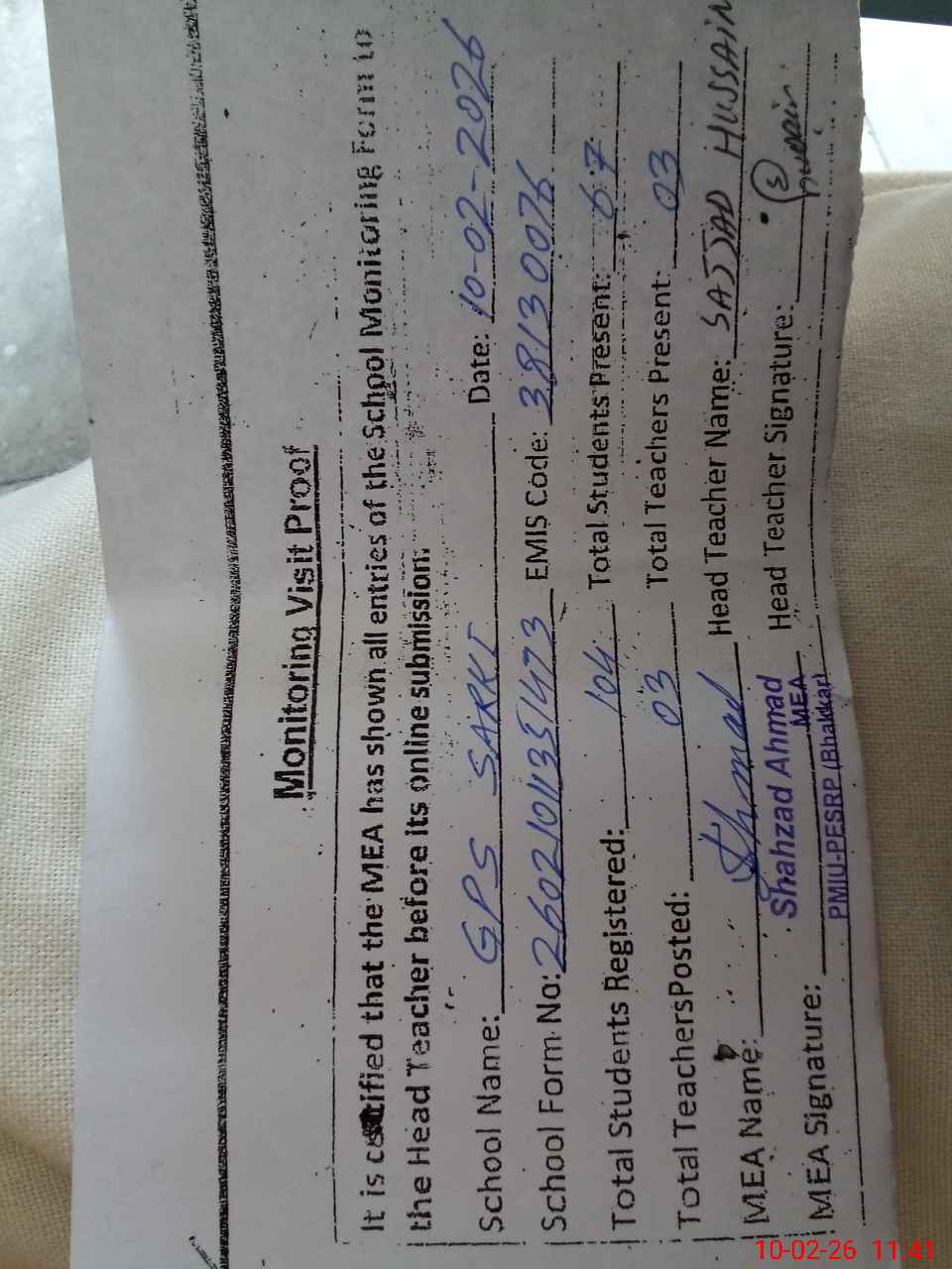 | Name: MU**** HU**** Designation: (School Headmaster's/Headmistress's) PTC/JV Phone/Cell Number: 03**** |