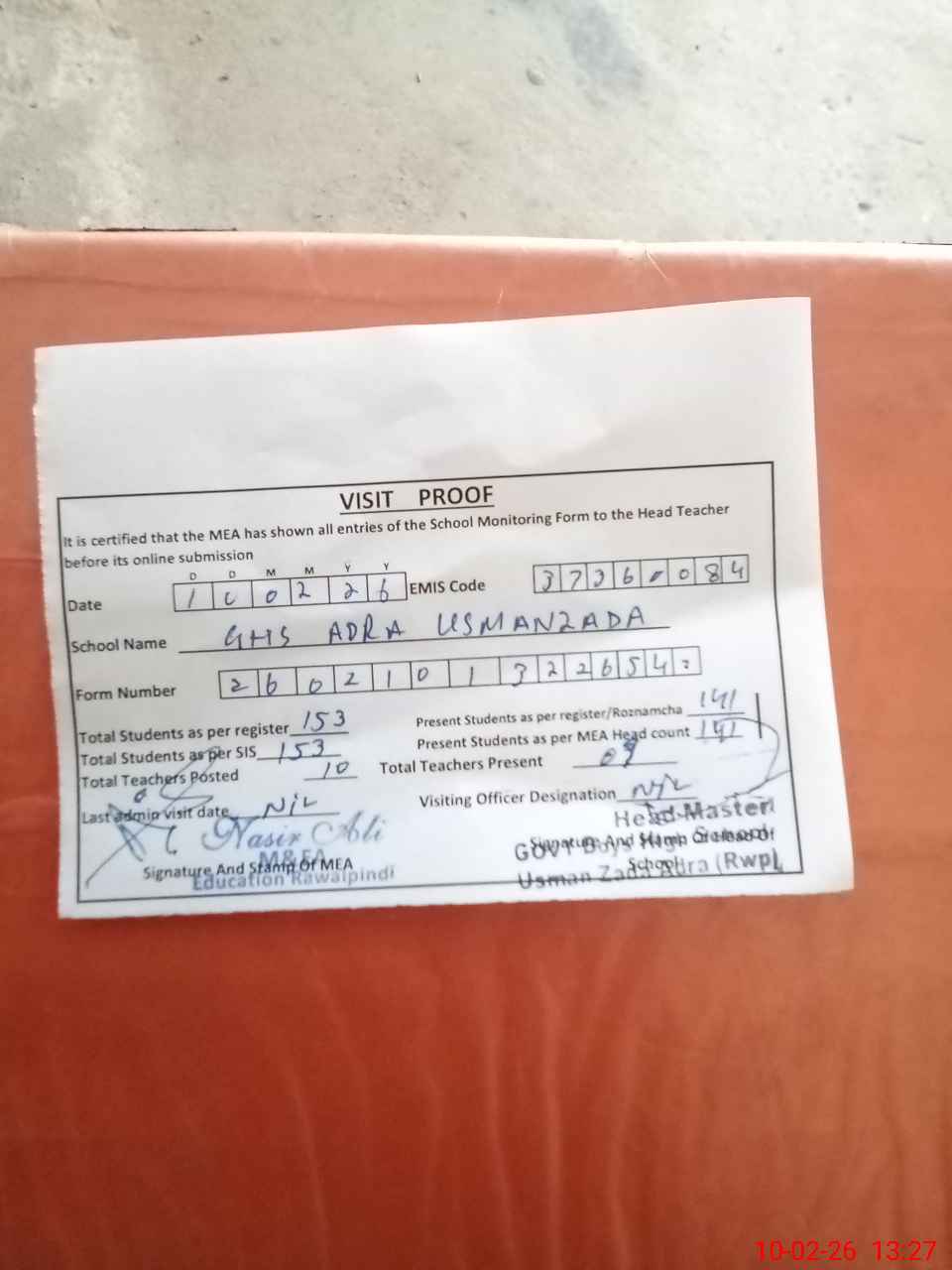 | Attendance Register | Head Teacher | MEA with School | Visit Proof |