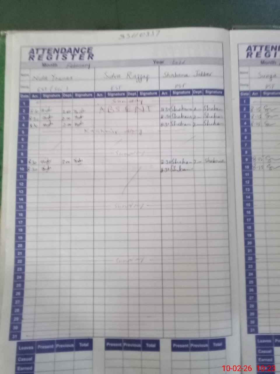 | 33**** | Iq**** Yo**** | JC | 1 | 0 | 0 | 0 | 0 | 0 | 0 | 0 | 1 | Absent (Un-Authorized) | |