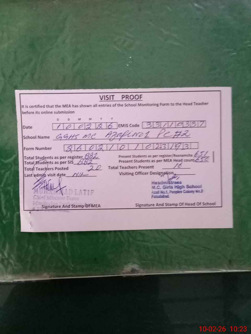 | EMIS Code: 33110337 | Name of School: GGHS MC AZAFI NO.1 PEOPLES COLONY NO.2 | |||